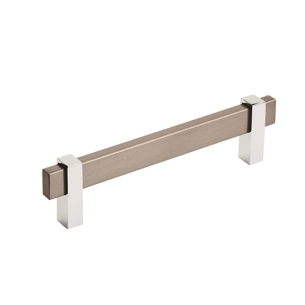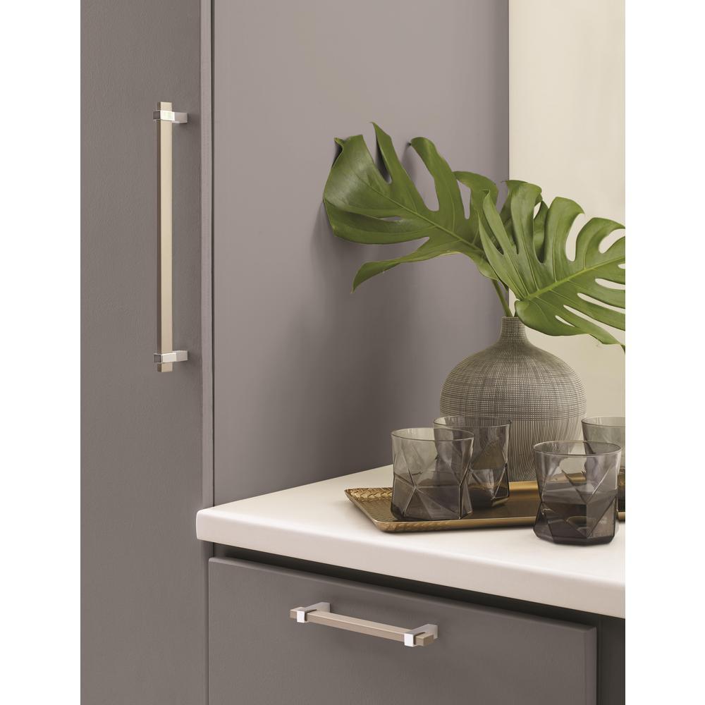 The Amerock BP36724SC26 Mulino 5-1/16 in. (128 mm) Center-to-Center Pull is finished in Silver Champagne/Polished Chrome. The inviting lines of Mulino are a testament to the allure of simplicity. Blending clean geometry with a split-finish assembled design, the collections minimal forms unite into a work of artistry. An alluring split finish with soft hues, Amerocks silver champagne/polished nickel finish marries the velvety warm glow and blush undertones of silver champagne with the shimmering mirrorlike nature of polished nickel. Founded in 1928, Amerocks award-winning home solutions including decorative and functional cabinet hardware, bath accessories, decorative hooks and wall plates have built the company's reputation for chic design accessories that inspire homeowners to express their personal style. Amerock offers a variety of styles and finishes at affordable prices that add the perfect finishing touch to any room.