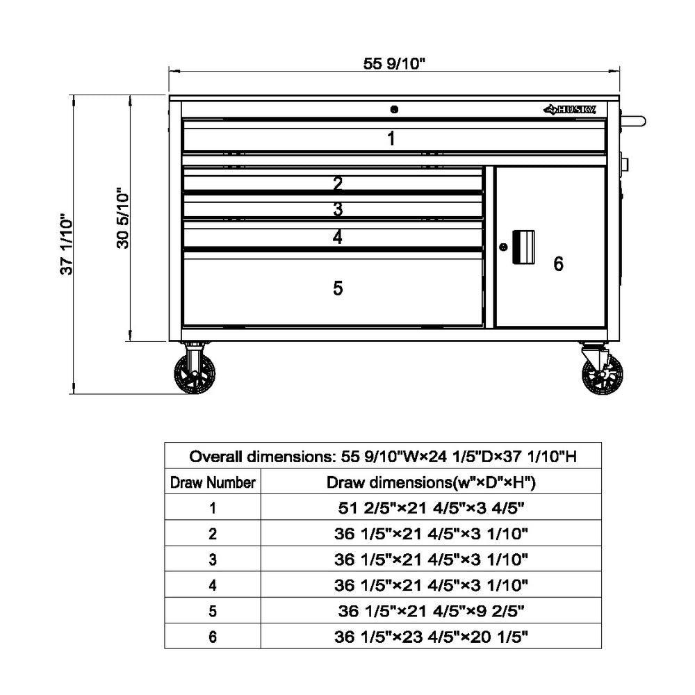• Drawer dimensions: top long drawer: 51.5 in. W x 21.8 in. D x 3.8 in. H, top 2 left-hand drawers: 36.3 in. W x 21.8 in. D x 3.1 in. H, 3rd left-hand drawer: 36.3 in. W x 21.8 in. D x 3.6 in. H, 4th left-hand drawer: 36.3 in. W x 21.8 in. D x 9.4 in. H