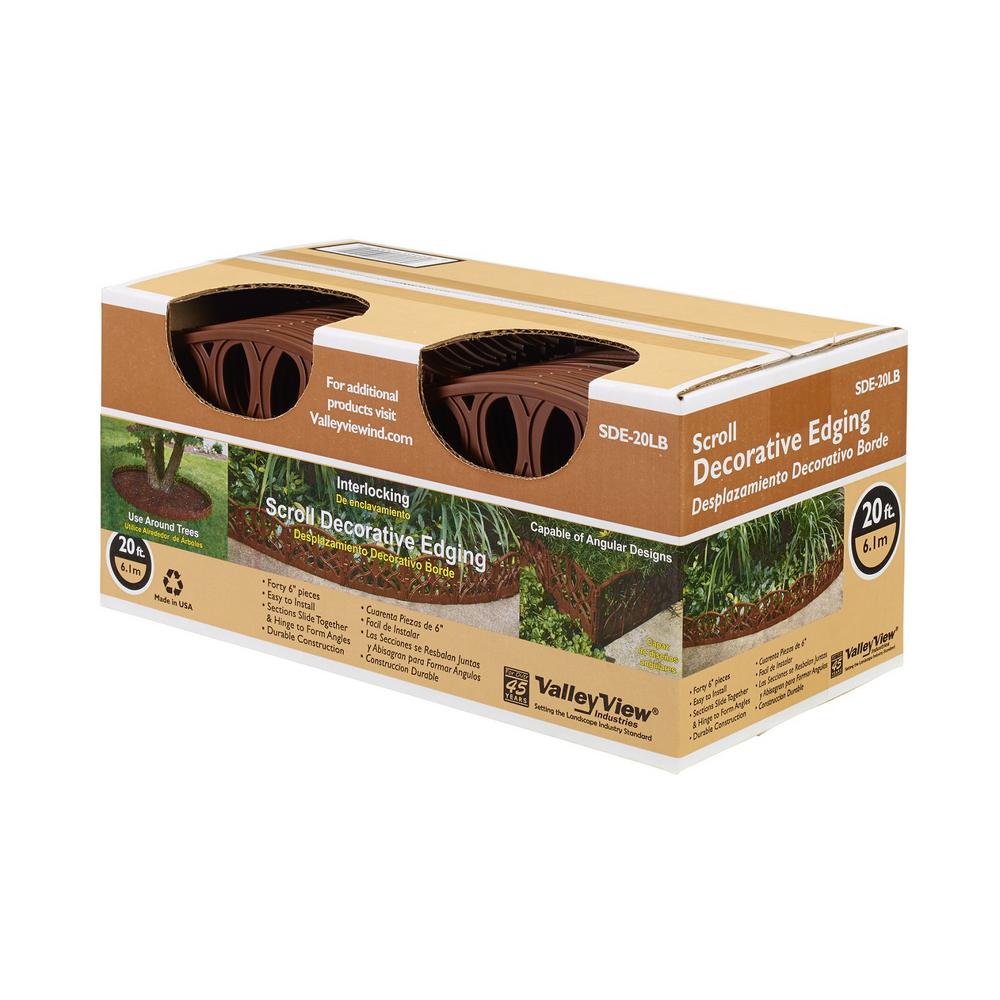 Decorative Light Brown interlocking scroll edging. The ONLY interlocking edging in the marketplace that allows for right angles and circular/curved designs. The unique hinge connecting system allows creativity. Forty 6 in. pieces. A flat spade shovel is all that is needed for proper installation. 6.25 in. H x 13.5 in. W x 7 in. L.