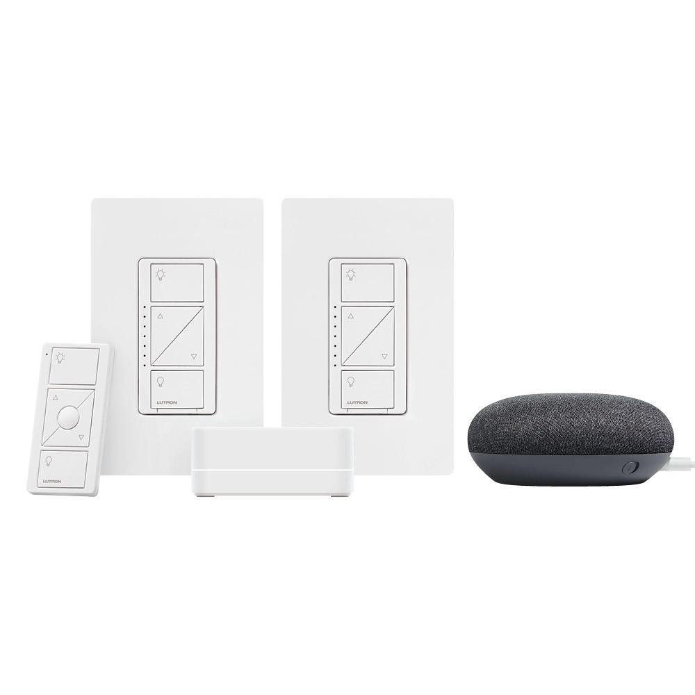 • Bundle includes: (1) Caseta wireless smart bridge, (2) Caseta wireless dimmer switches with wall plates, (1) Pico remote and (1) Google Home Mini