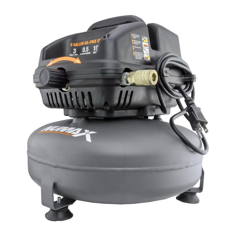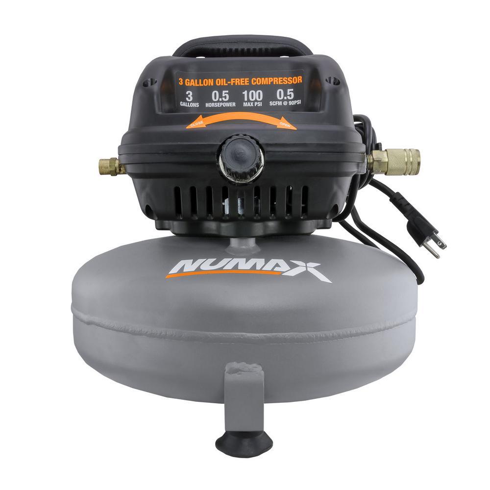 The NuMax S3GIUPCK 3 Gal. 1/2 HP Portable Electric Oil-Free Pancake Air Compressor with 22-Gauge Upholstery Stapler, 25 ft. Air Hose, 11-Piece Inflation Kit and Fasteners (200-count) is perfect for supplying power to your pneumatic tools, upholstery and fabric applications, as well as handling all your inflation needs. The compressor contains an oil-free 1/2 HP electric motor for less maintenance, with thermal overload protection to safeguard against overheating and extend the life of the motor. The steel 3 Gal. pancake tank is compact and durable and does not require much space to get the job done. The 2-Gauge for tank pressure and output air pressure are easy to read and the convenient easy carry handle makes transporting the lightweight compressor a breeze. The drain valve and safety valve are durably constructed of brass to resist rust and corrosion and a universal quick connect coupler makes it fast and easy to hook up your air powered tools. 3 no mar anti-vibration rubberized feet on the compressor prevent it from moving around, provide excellent stability and make it safe to use even on finished flooring surfaces. This 3 Gal. 1/2 HP Portable Electric Oil-Free Pancake Air Compressor Kit includes a 25 ft. air hose, 11-piece inflation kit, 22-Gauge Upholstery Stapler and 200 fasteners so you can get right to work and is covered by NuMax's 1-year Limited Warranty.