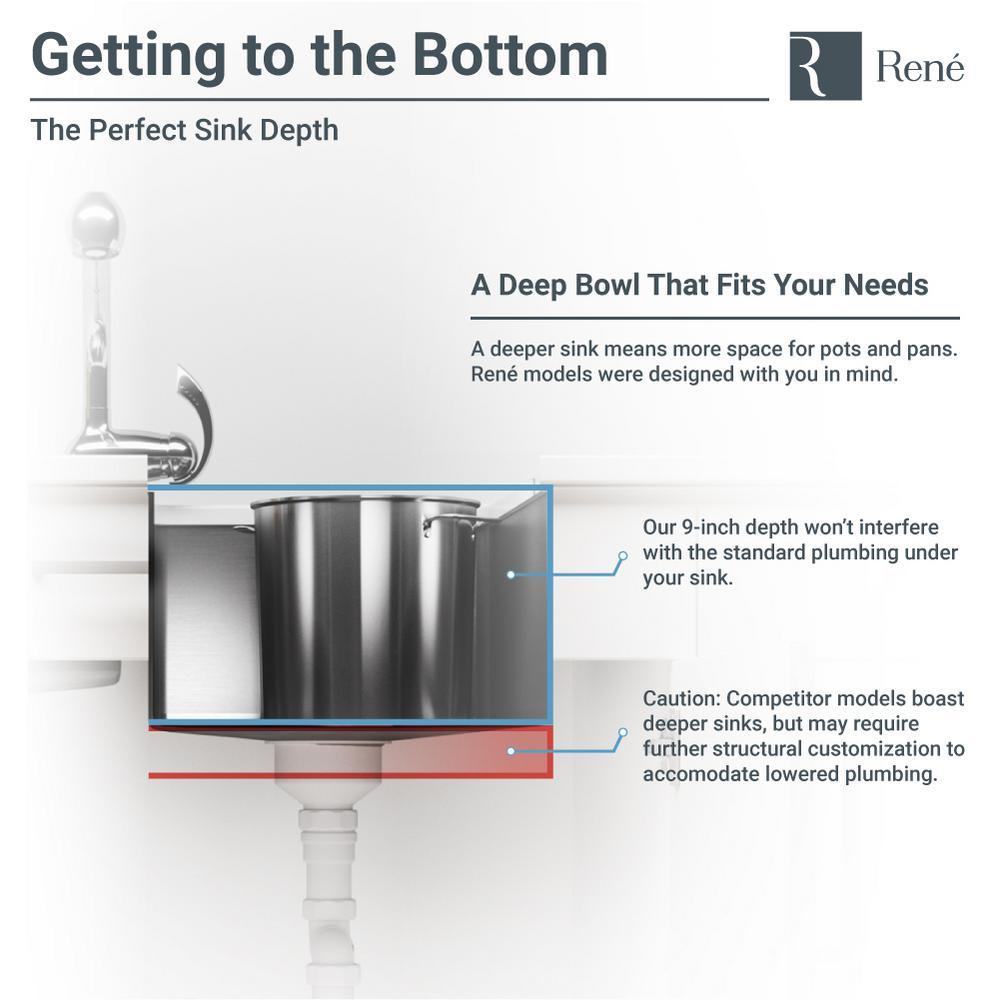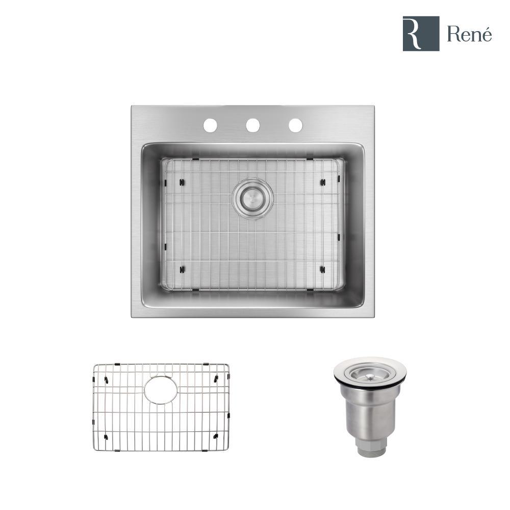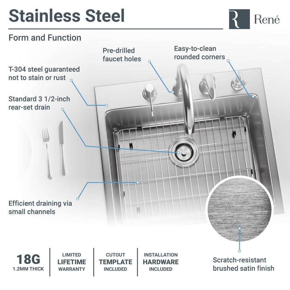 A spacious single-bowl, top mount sink with tight, 3/4 in. Dia corners and an offset drain. A moderate-sized sink, it is perfect for kitchens with limited space. The R1-2015-18 is constructed from a single sheet of the highest-quality 304 steel. Overall it measures 23 in. x 20 in. x 9 in., with a heavy-duty 18-Gauge thickness. Featuring an alluring brushed satin finish, it is rust and stain-resistant, insulated, quiet, and guaranteed by a limited lifetime warranty. Mounting hardware is included. To protect the sink surface from scratches or dents, 1 superior-quality, custom-fitted stainless steel grid is included. Its removable rubber feet raise it slightly above the bottom of the sink. The included basket strainer is capable of holding much more waste than common models. Its roomy interior is perforated and can be removed with its own handle.