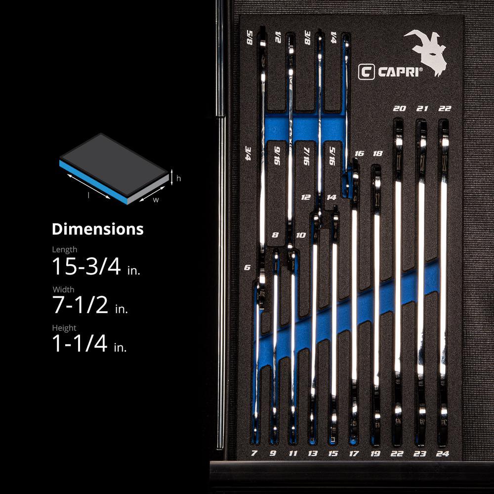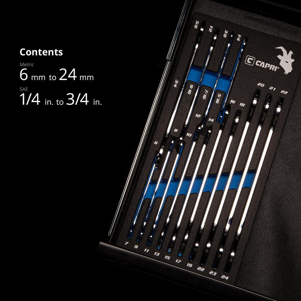 The Capri Tools Super-Thin Open End Wrenches have ultra-low profiles that let you reach fasteners in tight clearance. As thin as 2.2 mm to 5.6 mm, these open end wrenches are truly versatile and come in handy in a wide variety of applications. These super-thin wrenches are constructed of our premium Chrome Vanadium steel, forged with a complete 10-step state of the art heat treatment process. They are made for serious professional and made to last. Each is plated with our flawless SmartKrome plating, achieved through thorough polishing and careful application, to ensure durability and corrosion resistance. Set comes with 14 open end wrenches with 20 metric and 8 SAE sizes: 6 mm, 7 mm, 8 mm, 9 mm 10 mm, 11 mm, 12 mm, 13 mm, 14 mm, 15 mm, 16 mm, 17 mm, 18 mm, 19 mm, 20 mm, 21 mm, 22 mm, 23 mm, 24 mm, 1/4 in., 5/16 in., 3/8 in., 7/16 in., 1/2 in., 9/16 in., 5/8 in. and 3/4 in. Thinness: 2.2 mm thin (6 mm to 7 mm and 1/4 in. to 5/16 in. open ends), 2.6 mm thin (8 mm to 11 mm and 3/8 in. to 7/16 in. open ends), 3.6 mm thin (12 mm to 15 mm and 1/2 in. to 9/16 in. open ends), 4.6 mm thin (16 mm to 19 mm and 5/8 in. to 3/4 in. open ends), 5.6 mm thin (20 mm to 24 mm open ends). Comes in our own spill-resistant Mechanics Tray for easy organization and storage. Tray dimensions: 15-3/4 in. L x 7-1/2 in. W x 1-1/4 in. H, fits comfortably in most tool chests and cabinets.