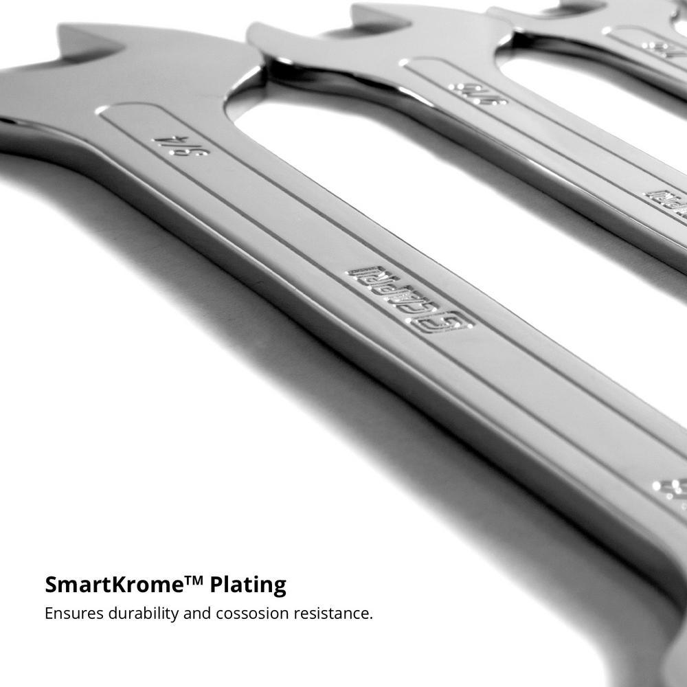 • Set of 14 open end wrenches with 20 metric and 8 SAE sizes: 6 mm, 7 mm, 8 mm, 9 mm, 10 mm, 11 mm, 12 mm, 13 mm, 14 mm, 15 mm, 16 mm, 17 mm, 18 mm, 19 mm, 20 mm, 21 mm, 22 mm, 23 mm, 24 mm, 1/4 in., 5/16 in., 3/8 in., 7/16 in., 1/2 in., 9/16 in., 5/8 in. and 3/4 in.