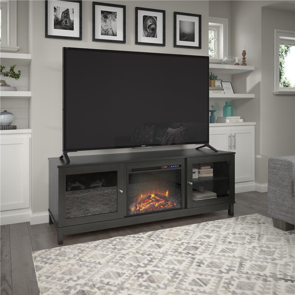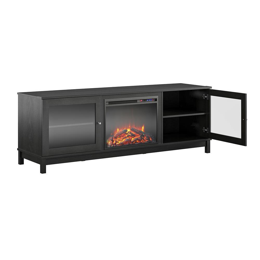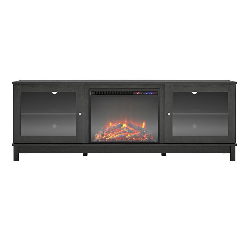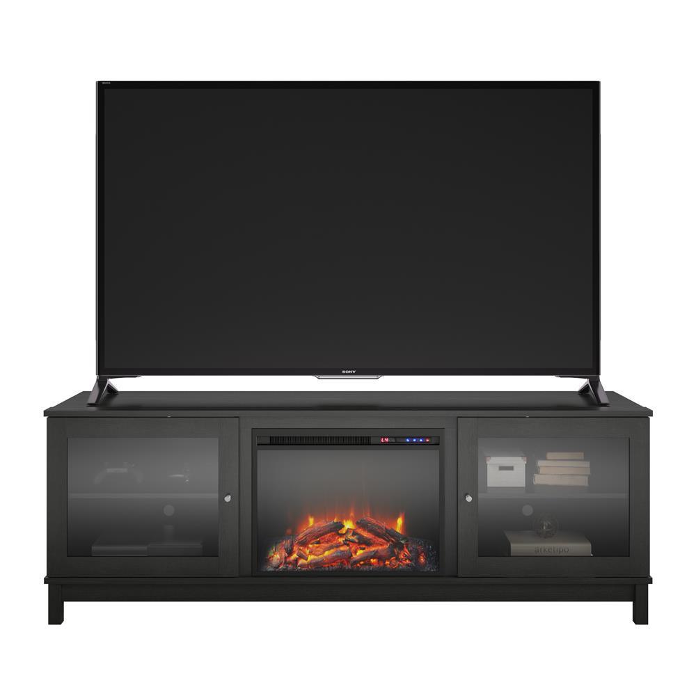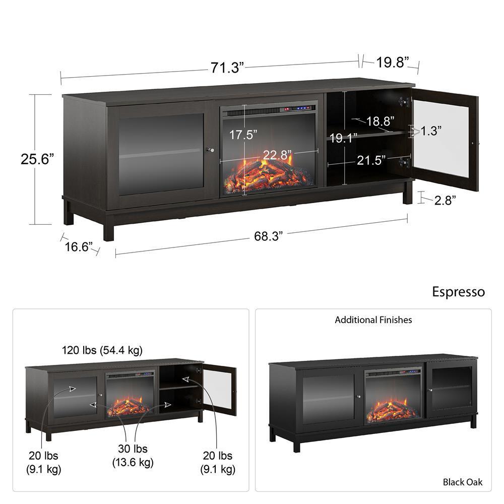 Finish your living room or family room with the Ameriwood Home Andele Fireplace TV Stand. This classic TV Stand can accommodate most TVs up to 70 in. W or up to 120 lbs. The Stand is made of laminated MDF and particleboard for a sturdy yet lightweight build that won't break your budget. Finished in a black oak woodgrain finish, the doors feature glass inserts for an updated look. The 23 in. electric fireplace insert features a realistic flame effect that can be used with or without heat so you can keep the ambiance even in the warm summer months. Use the remote or touch panel to adjust the flame and heat settings to keep your room comfortable at all times. The insert can heat a room up to 400 sq. ft. and plugs into a standard 120-Volt outlet. The LED light source boasts up to 50,000-hours of life so you can enjoy the flame effect for years to come. The 4-shelves behind the doors provides the perfect home for all of your audio and video components and offer wire management holes to keep your cords tangle free. The adjustable shelves let you customize the spacing to fit your needs. The Stand ships flat to your door in 2 boxes and requires assembly upon opening. 2 adults are recommended to assemble and move. Once assembled, the Stand measures to be 25.6 in. H x 71.3 in. W x 19.8 in. D.