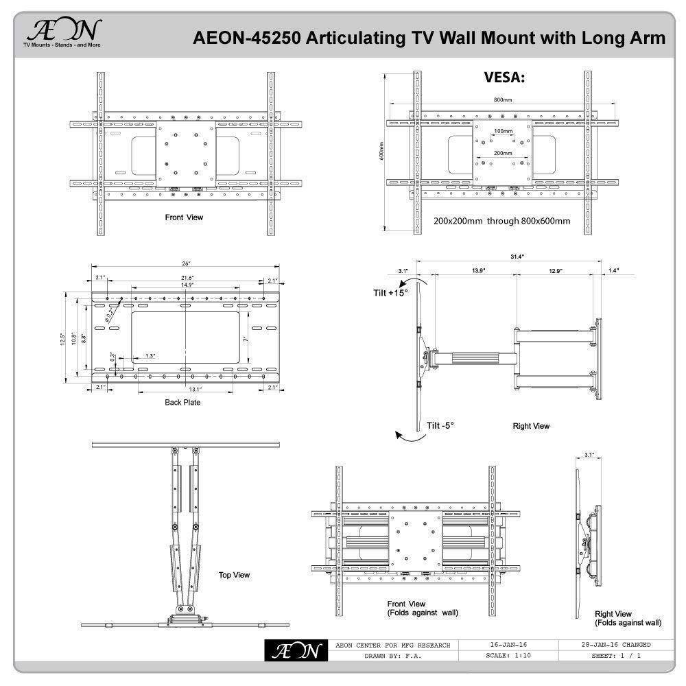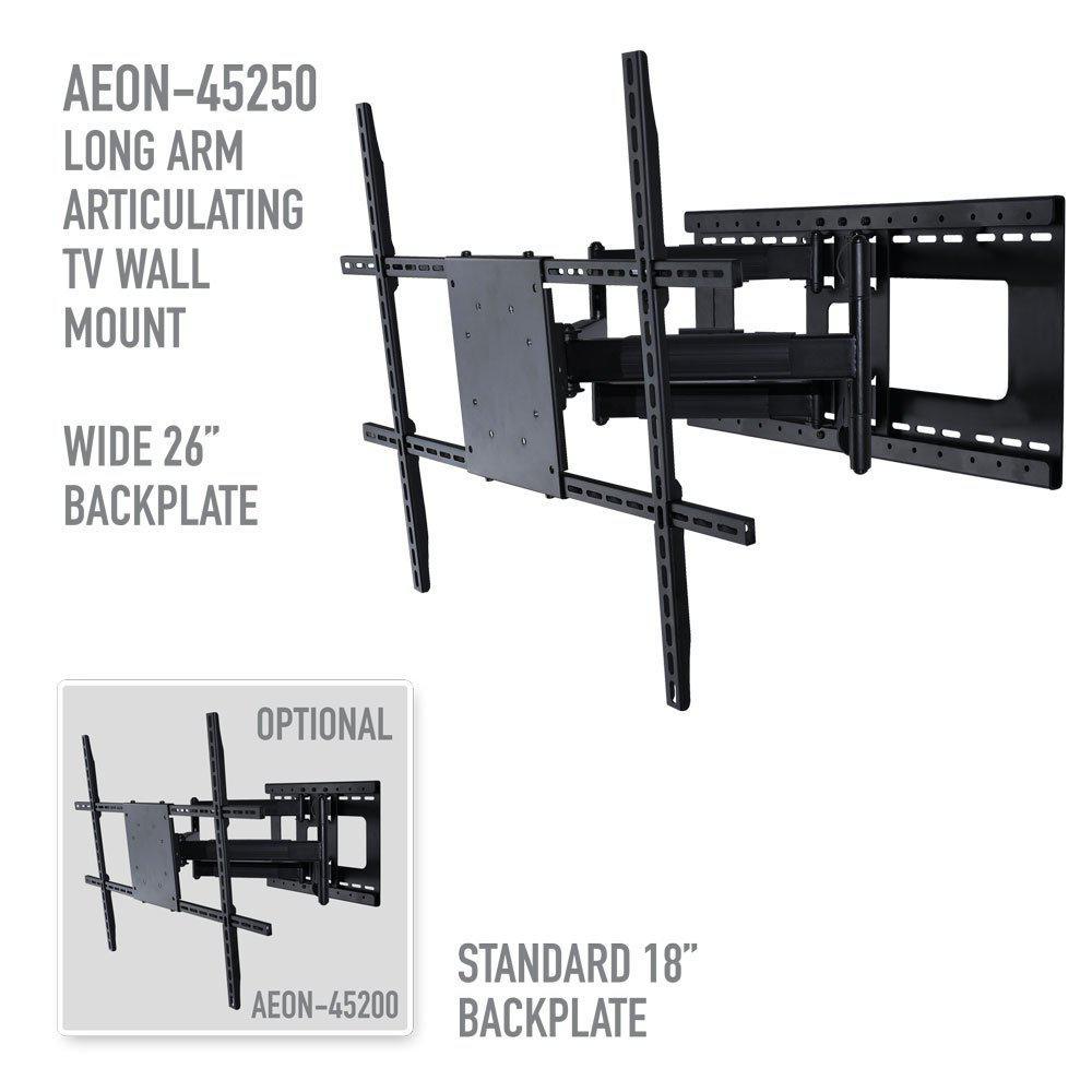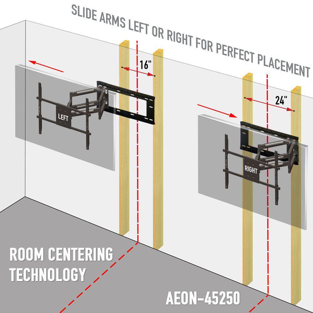 This premium Articulating TV Wall Mount and Full Motion Sliding TV Wall Mount extends more than 31.5 in. and pivots/swings right or left for optimal viewing. The best Articulating TV mount to use as a corner TV wall mount because of its right and left sliding movement. Place the full motion TV mount near the corner of your room, then slide the mounting mechanism right or left for the best placement of your TV in the corner. It is the only articulating arm TV Mount on the market that is suited for corner wall mounting. Built for Plasma, LED and LCD TVs that are 42 in. - 80 in. in size. Sturdy constructed articulating arm mounts offer extra strong support for your security and ease mind. TV wall mount tilting feature tilts your TV up to 15° or down to 5°. Movement is easy with the Aeon articulating TV mount, simply push or pull your TV to the desired location and it will move easily and freely, no tools required. With up to 180° of free movement, your TV can be viewed from any angle. Perfect as a corner TV wall mount by positioning your TV in any corner of any room. Easy to use built-in cable management is included for a clean look and will prevent pinching/breaking of your audio video and power cables. The articulating TV mount is easy to install to your wall and adjustable for perfect display.