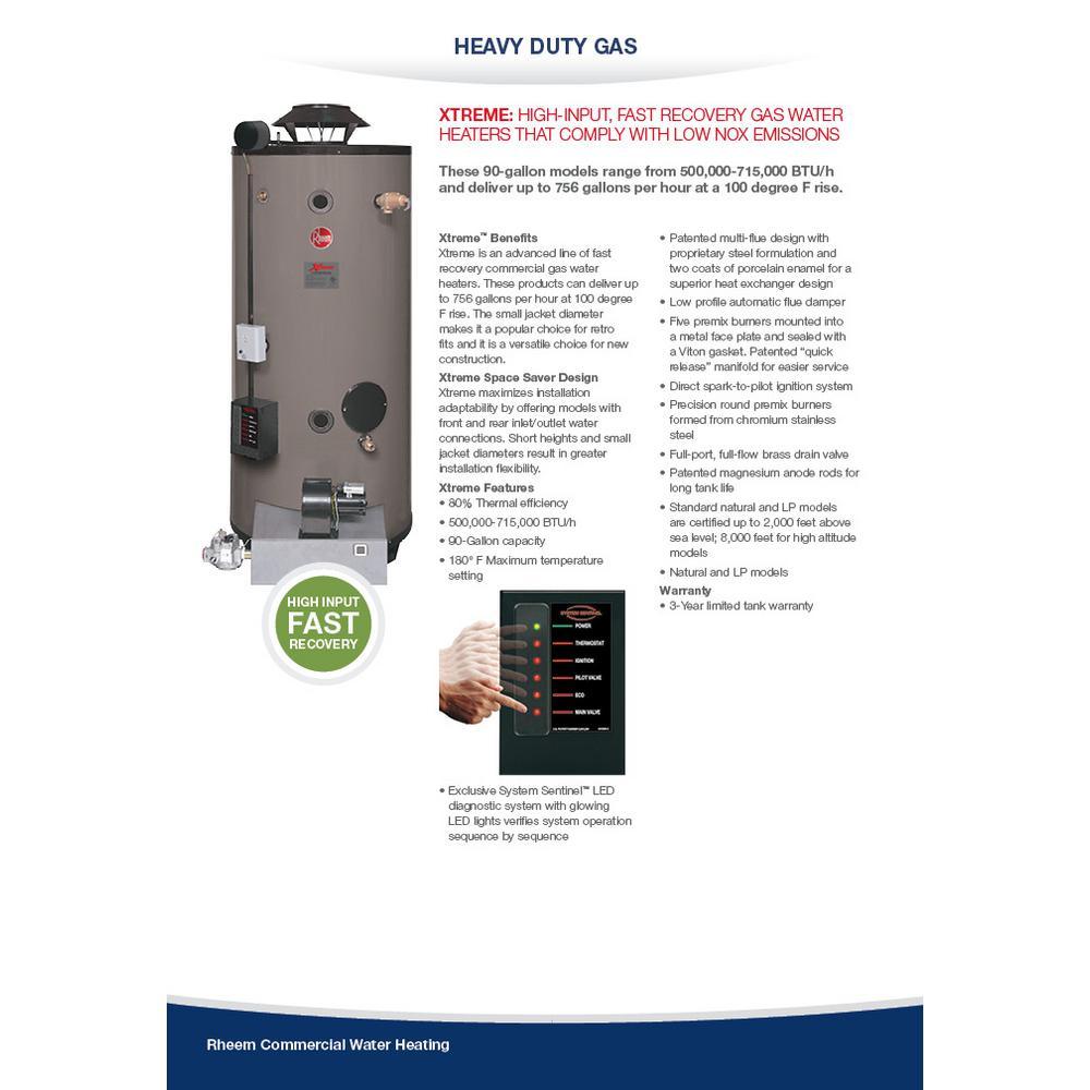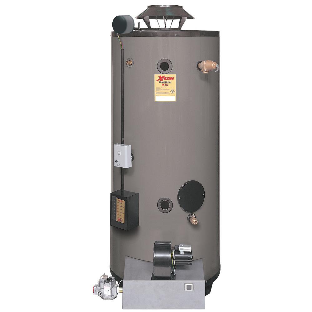 Xtreme is an advanced line of fast recovery heavy duty commercial gas water heaters. Its smaller jacket diameter makes it a popular retrofit option. The tighter the commercial retrofit, the more you will appreciate how Xtreme's compact size and multiple water connections simplify installations. This 90 Gal. model delivers up to 621 GPH at 100°F rise. Please Note: This model requires a 120-Volt power source.