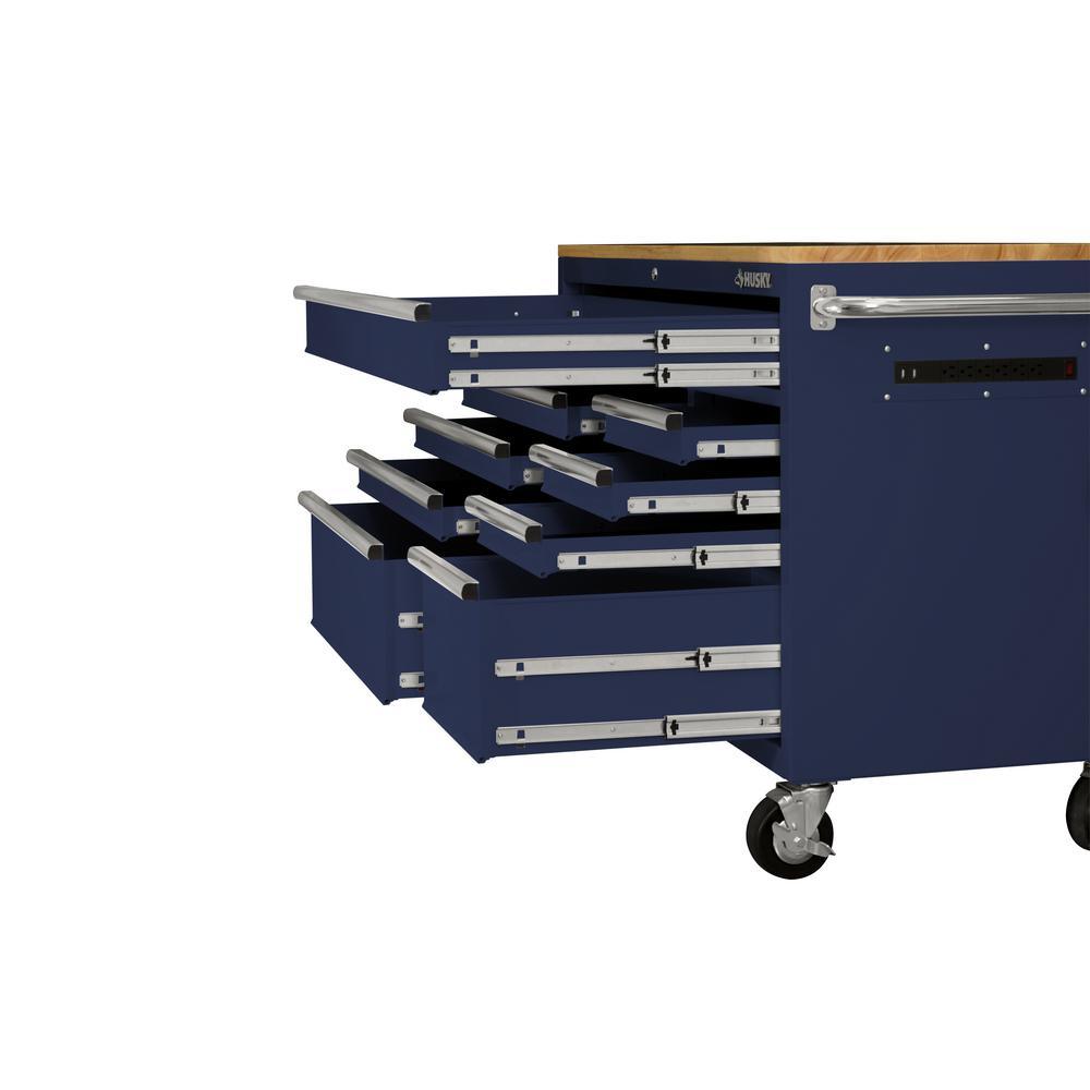 Built for its functional workspace and large storage capacity this work bench is the perfect combination for your tool storage system. This mobile work center has large, 5 in. x 2 in. casters and a steel tubular side handle, which allow you to easily move it, even when fully loaded. Each drawer is equipped with 100 lbs. rated soft closing ball bearing slides. The top long drawer and 2 deep bottom drawers have double sets of 100 lbs. rated soft closing slides to enable you to store your heavier bulk items. It is constructed with heavy 21-Gauge steel and is strong enough to support 1,200 lbs. and has 23,362 cu. in. storage capacity. The 1 in. thick solid wood top is sealed with a protective coating to protect it from the elements.