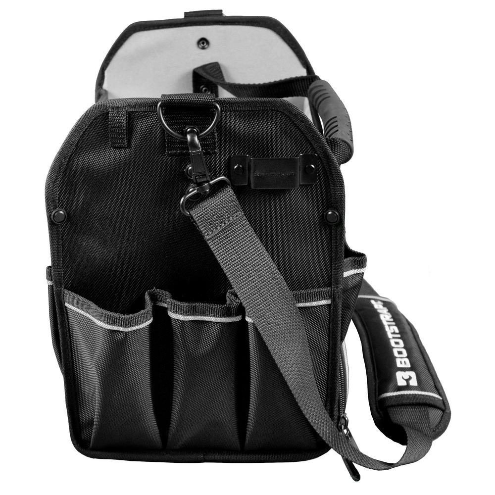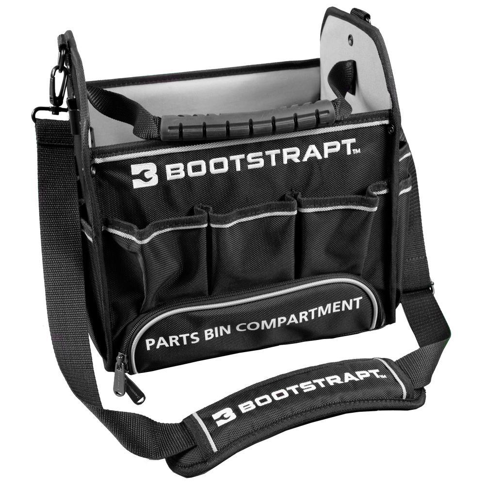 Introducing the Bootstrapt 12 in. Electrician’s Tote with Integrated Parts Bin Compartment. It includes a 10 in. Parts Bin Organizer and features 28 pockets and loops, a tape measure holder and 1680 Denier Ballistic material for maximum durability. Heavy-duty feet protect the base from damage and ensure the bag stays out of puddles or dirt. The included Parts Organizer fits conveniently in the base of the tote in a separate zippered compartment. The heavy-duty handle with rubber grip easily folds out of the way for fast access to your tools and the padded shoulder strap easily adjusts for a comfortable carry. For premium features and heavy-duty construction, choose Bootstrapt to keep your tools close and get the job done. Bootstrapt - Built from the ground up.