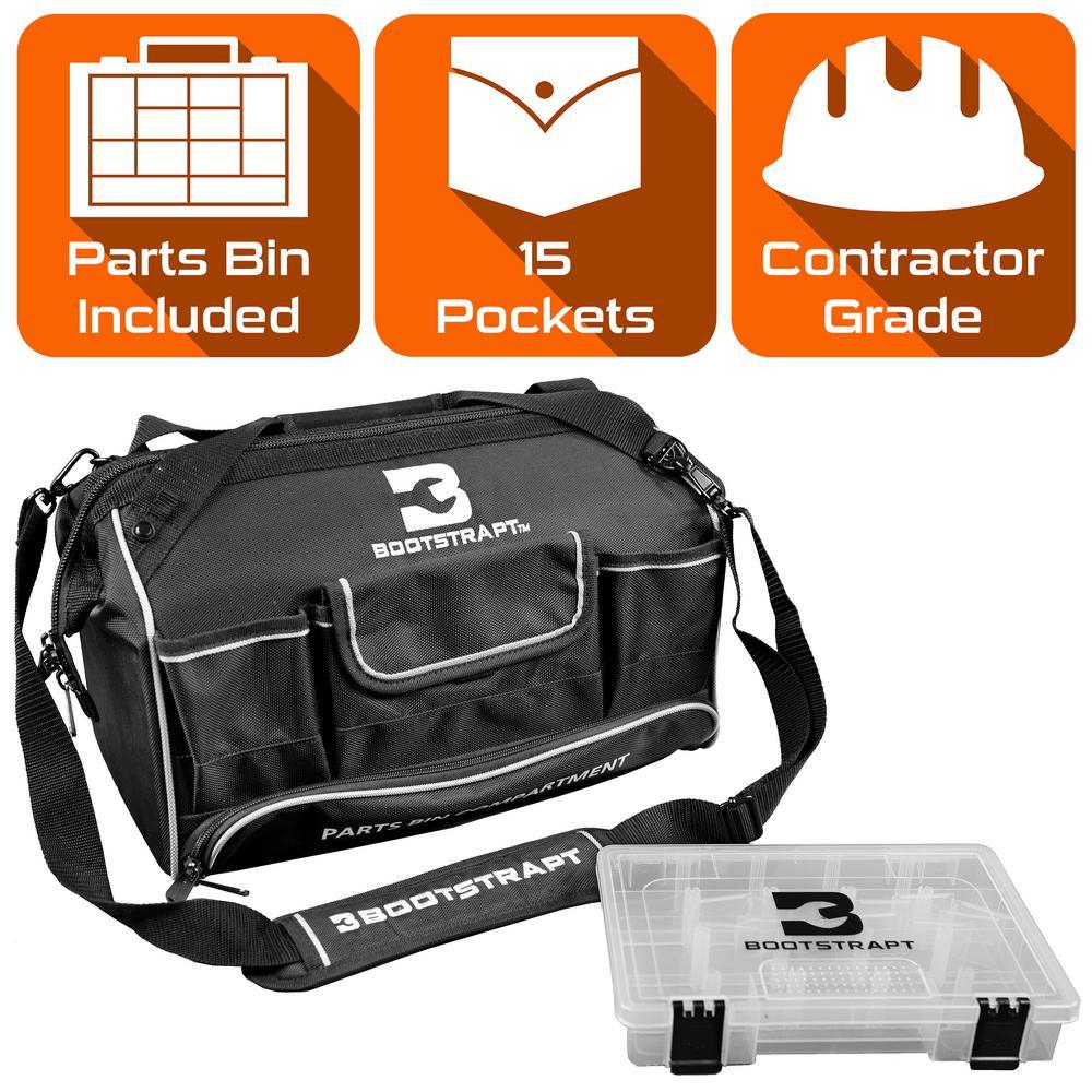 Introducing the Bootstrapt 16 in. Large Mouth Tool Bag with Integrated Parts Bin Organizer. It includes a 10 in. Parts Bin Organizer and features 15 pockets, 8 tool loops and 1680 Denier Ballistic material for maximum durability. Heavy-duty feet protect the base from damage and ensure the bag stays out of puddles or dirt. The included Parts Organizer fits conveniently in the base of the bag in a separate zippered compartment. The soft grip handles are designed to evenly distribute the weight across the entire bag, the large mouth allows for or easy access to your tools and the padded shoulder strap easily adjusts for a comfortable carry. For premium features and heavy-duty construction, choose Bootstrapt to keep your tools close and get the job done. Bootstrapt - Built from the ground up.
