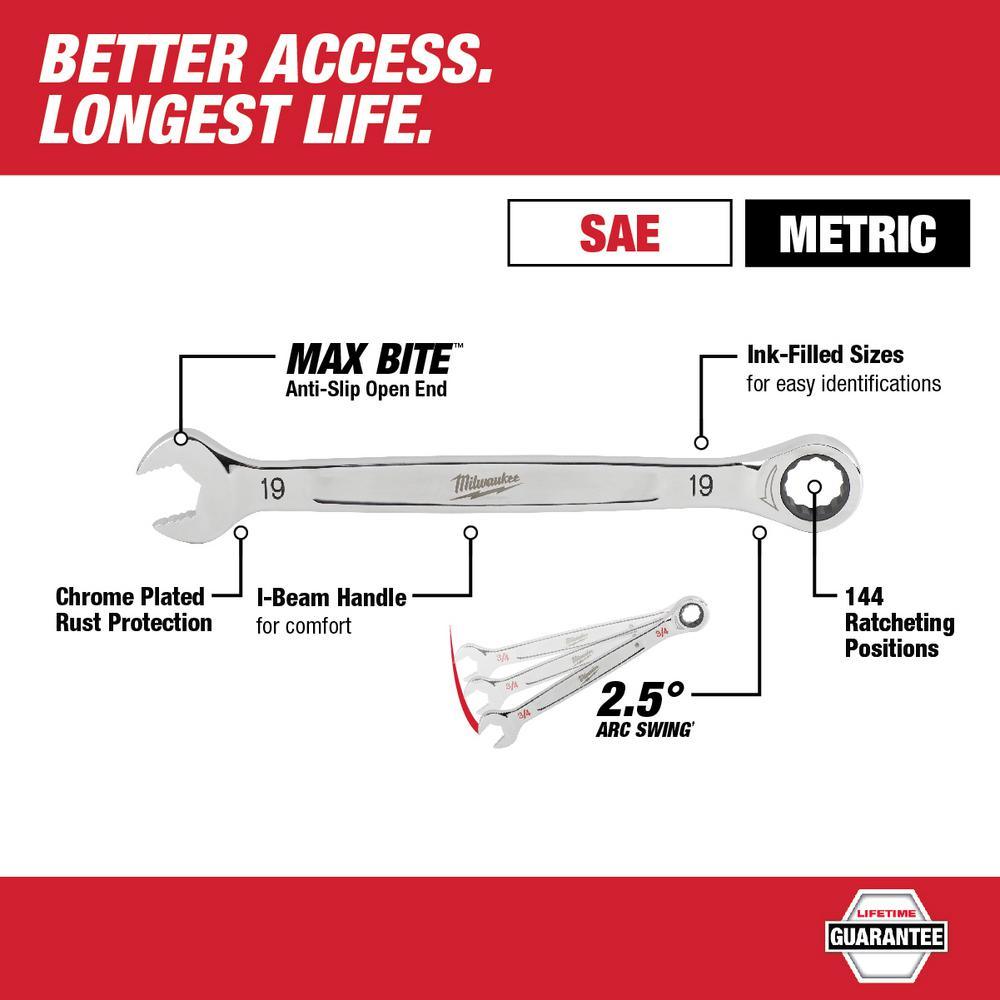 • Ratcheting combination wrenches: 2.5° of arc swing & 144 ratcheting positions for tight spaces