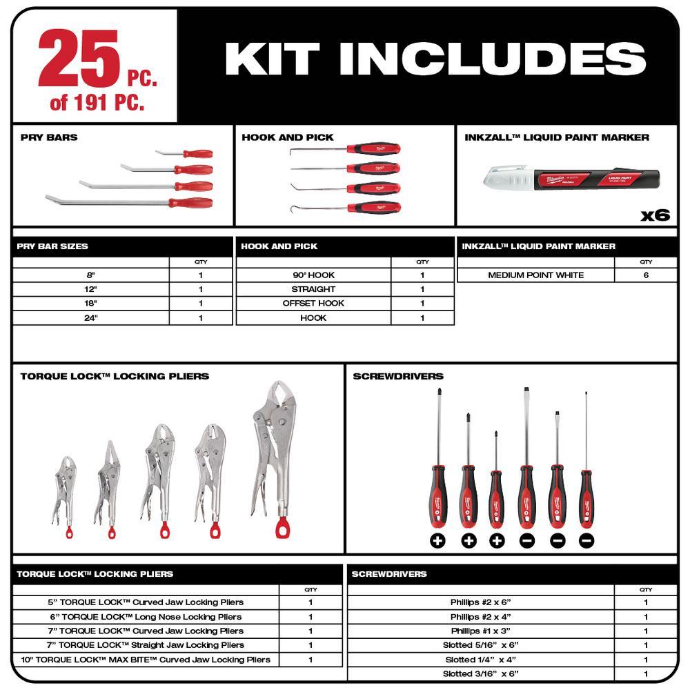 • 3/8" DRIVE 56PC SOCKET SET (48-22-9008), 1/4" DRIVE 50PC SOCKET SET (48-22-9004), 15PC RATCHETING COMBO WRENCHES -SAE (48-22-9416), 15PC RATCHETING COMBO WRENCHES - METRIC (48-22-9516), 15PC COMBO WRENCH KIT - SAE (48-22-9415), 15PC COMBO WRENCH KIT - METRIC (48-22-9515), 6PC SCREWDRIVER SET (48-22-2706), 4PC PRY BAR SET (48-22-9214), HOOK AND PICK SET (48-22-9215), 5PC TORQUE LOCK PLIERS KIT (48-22-3695), 1PK WHITE PAINT MARKER (48-22-3712)