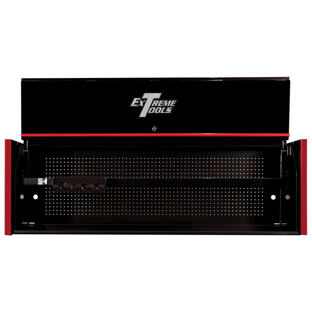 Extreme Tools RX Series RX722501HC 72 in. Extreme Power Workstation Professional Hutch creates a convenient, organized work space in your shop. Our patented hutch includes an adjustable shelf with built-in slots/holes for organizing tools and a power strip housing 3 electrical outlets and 2 USB ports. The specially-engineered shelf is designed to hold removable accessories: Power Tool Rack (included) and optional socket holder, media/electronics stand and universal charging pad. Steel peg board sides and back panel provide a convenient space for hanging tools, hoses, etc. The locking lid has a full-width, polished extruded aluminum handle and is held open with 2 sturdy gas struts. The hutch has a durable, AkzoNobel high gloss powder coat finish to keep it looking great for years to come. Lock it up with a secure, tubular coded lock and keys. Hutch is easily assembled on RX Series 72 in. Roller Cabinet. Includes all Parts/Hardware (see Owner's Manual), 2 Keys, 3 Outlet/2 USB Port Power Strip, Power Tool Rack accessory.