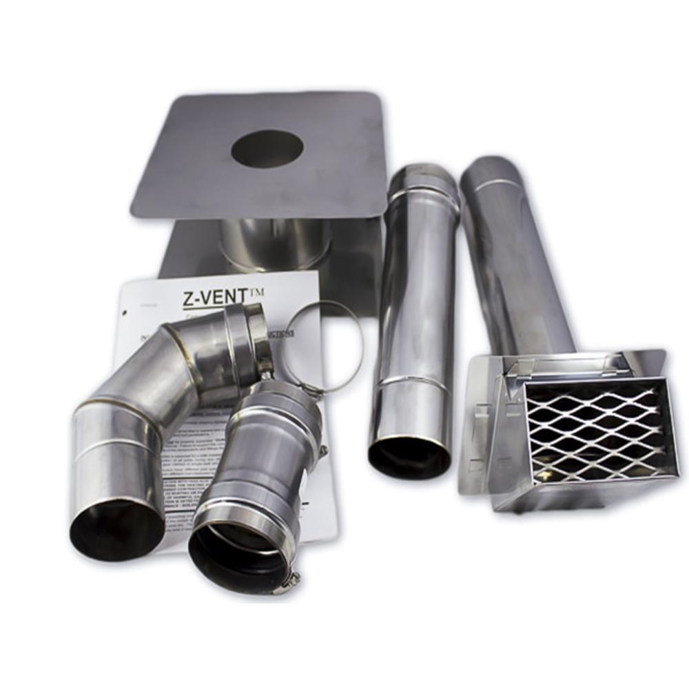 This 3 in. single walled Horizontal Stainless Steel Z-Vent Wall Hung Water Heater Vent Kit is supplied with all the necessary components for a quick and seamless installation. It includes the following pieces: 1-Termination Hood with Backflow Preventer one 3 in. x 90° Elbow one 3 in. x 1 in. Pipe one 3 in. Wall Thimble one 3 in. Appliance Adapter Made of AL29-4C stainless steel. This is Category II/III and UL approved.