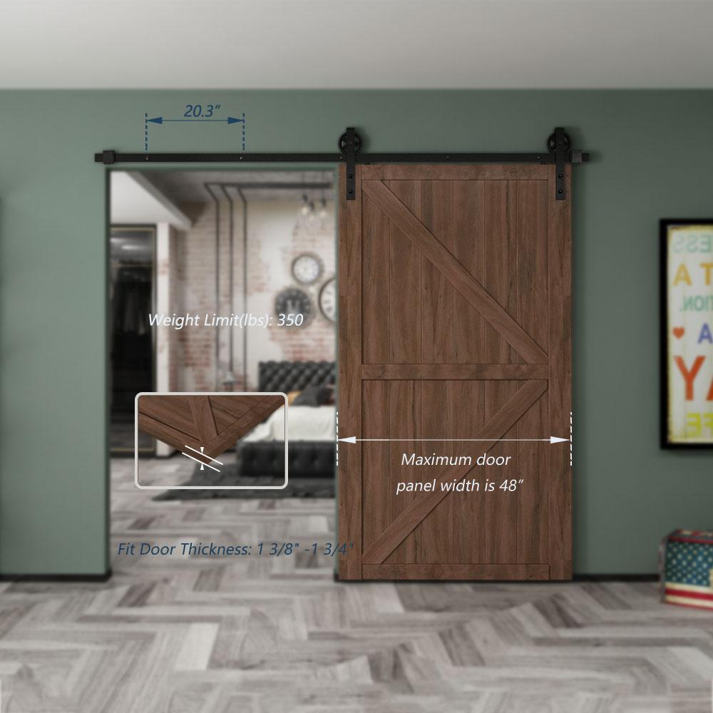 - Pre-install notice: only the hardware is for sale, doors are not included the hardware package has lag bolts for wooden wall/drywall/concrete wall our sliding barn door hardware kit is compatible with door thickness from 1-3/8 in. to 1-3/4 in. if you have a door trim, you would better put a header board that is as thick as the trim and then attach the rail to the header board you need to have at least 8 in. of space between the top of the door to the ceiling to accommodate the hardware we use 2 hangers to hold 1 door, for a single door kit, there will be 2 hangers in the package, for a double door kit, there will be 4 hangers, if you have a door that is either too wide or too heavy, then you can purchase additional hangers for that door