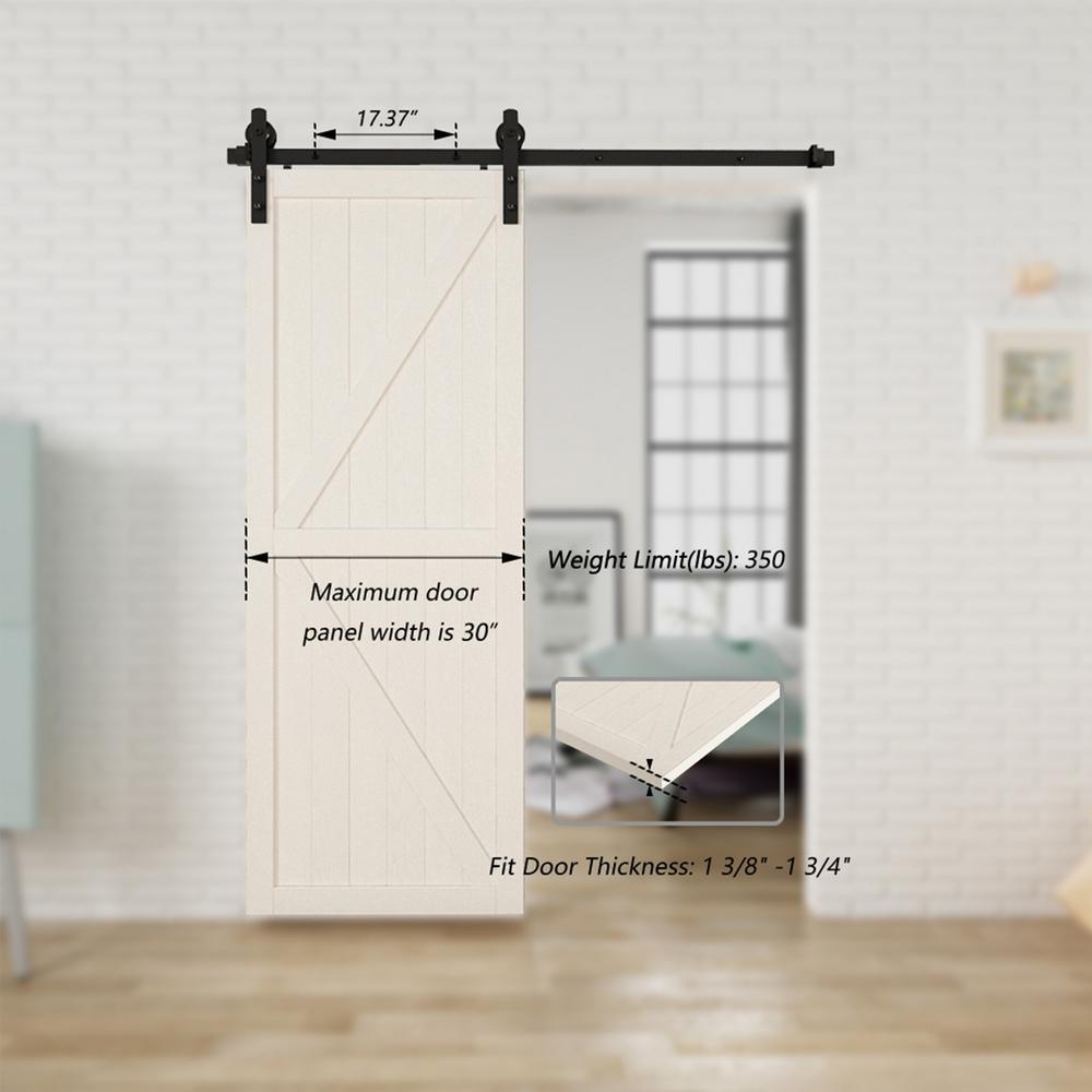 - Pre-install notice: 1) only the hardware is for sale, doors are not included, 2) the hardware package has lag bolts for wooden walls, 3) our sliding barn door hardware kit is compatible with door thickness from 1-3/8 in. to 1-3/4 in. 4) if you have a door trim, you would better put a header board that is as thick as the trim and then attach the rail to the header board, 5) you need to have at least 5 in. of space between the top of the door to the ceiling to accommodate the hardware, 6) we use 2 hangers to hold 1 door, for a single door kit, there will be 2 hangers in the package, for a double door kit, there will be 4 hangers, if you have a door that is either too wide or too heavy, then you can purchase additional hangers for that door