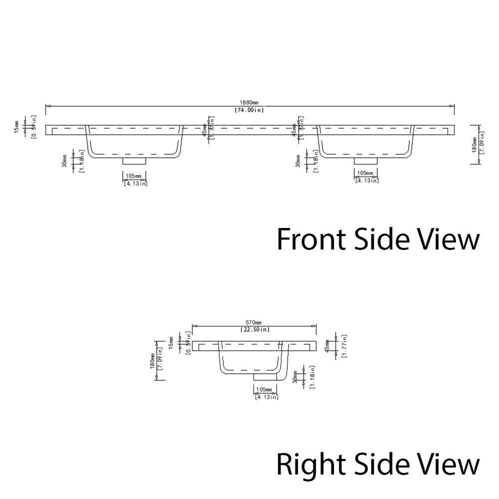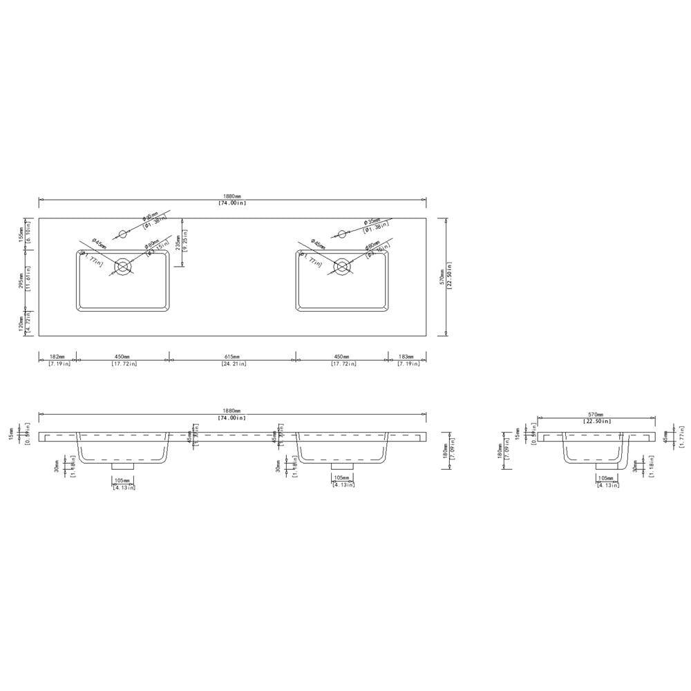 Dyconn Faucet Carrara series solid surface countertop is cast out of a mixture of stone, aluminum and acrylic resin. The stain-resistant material is easy to clean and maintain. Due to its special mixtures, the material can be sanded down for removing scratches and restored to its original matte finish within a matter of seconds. The Carrara vanity top is integrated with a contemporary deep rectangular basin bowl to minimize water splash. Carrara Series fits in 24 in., 36 in., 48 in., 60 in., and 72 in. and the single basin design maximizes the countertop space (except 72 in.) The Carrara vanity top is designed with a hangover edge around the standard vanity cabinet. (Please refer to our dimension drawing).