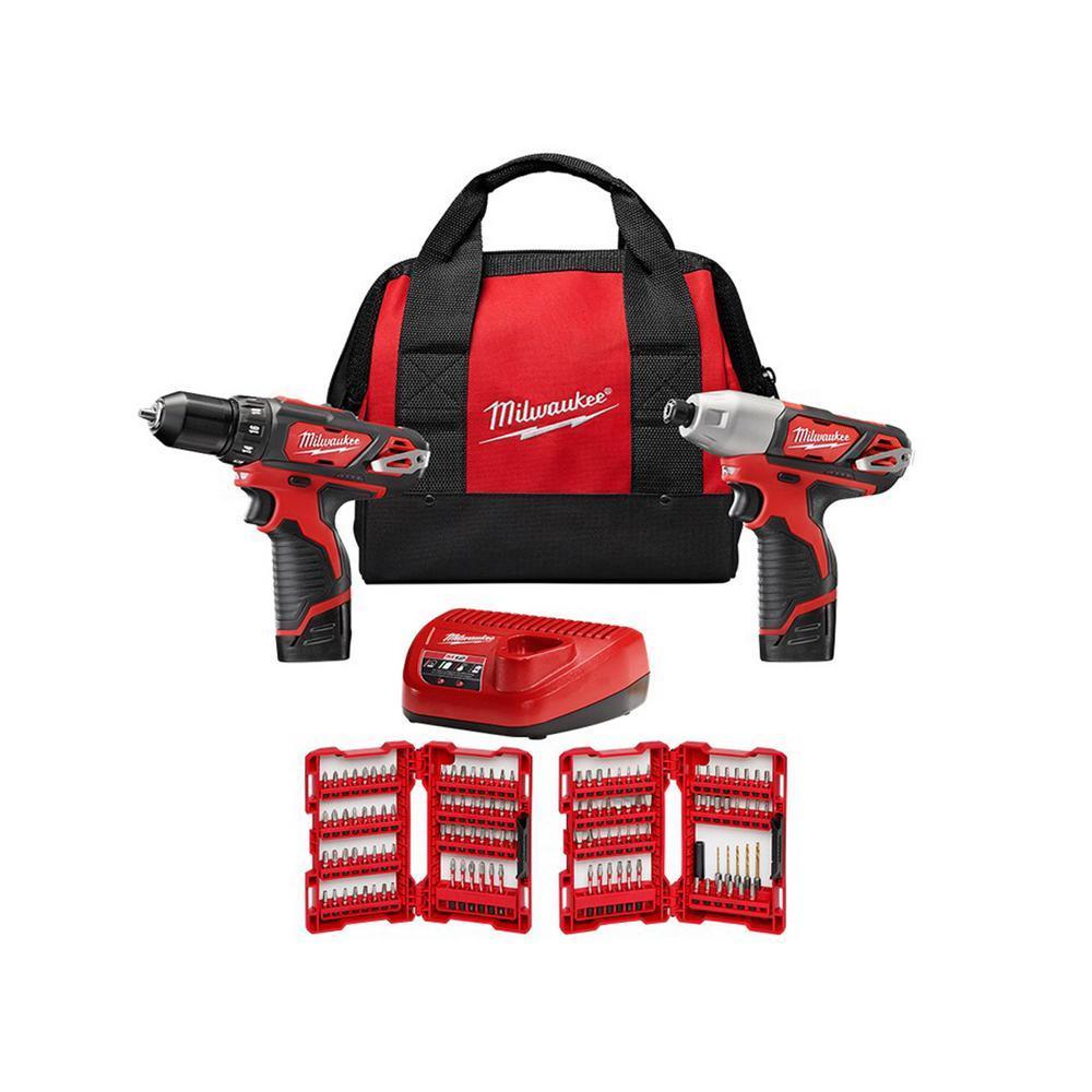 The Milwaukee M12 2-Tool Combo Kit includes the M12 3/8 in. Drill/Driver (2407-20) and the M12 1/4 in. Hex Impact Driver (2462-20). The powerful compact cordless drill driver delivers 275 in./lbs. of torque up to 25% more torque than the competition and 0 RPM to 400 RPM/0 RPM to 1,500 RPM. The impact driver's high-performance motor gives users 0 RPM to 2,500 RPM for increased fastening speed. The innovative M12 cordless lithium-ion system is designed to provide users with the power and torque required for professional applications, in a size that allows users to reach the tightest and toughest spaces. The Milwaukee 15-piece SHOCKWAVE Impact Duty Titanium Drill Bit Set with Red Helix are engineered for impacts drivers and drills. RED HELIX Drill Bit Kit is engineered for extreme durability and long-life in hard metal applications. The drill bits are designed with Variable Helix featuring an aggressive 35 Helix Angle ending at 15. This allows for Rapid Chip Removal, limiting heat buildup to stay sharper longer. The 135 split point drill bit tip delivers a precision start and prevents walking for fast, accurate holes. The titanium coated bits can be used in all drilling applications giving up to 3X life versus Black Oxide drill bits.