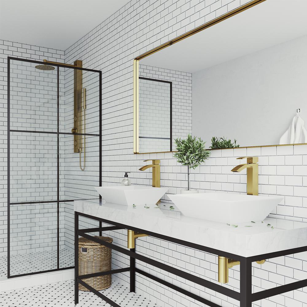 Durability drives the force behind the VIGO Vinca Matte Stone sink with the VIGO Duris Vessel Bathroom Faucet Set in matte brushed gold. This bathroom vessel set offers modernity at its finest. The sink is made from VIGO's proprietary Matte Stone construction, a solid to the core, non-porous composite material that resists scratches, stains, and impact. Impressive in build and made to last for years of use, this sink is impeccable in both style and structure. It is durable and stylish, making it just what you need to pair with a sleek faucet like the VIGO Duris Single-Handle Vessel Mount. This faucet has 100% solid brass construction, making it the epitome of strength and resilience. Its vessel mount installation frees up counterspace to offer a more spacious layout. The faucet's water volume and temperature operations are controlled by the use of just one, easy to use lever. With a 1.2 GPM flow rate, the VIGO Duris conserves water without compromising performance. Practical and stylish, this faucet does it all. The bathroom sink set comes complete with a matching matte brushed gold pop-up drain and mounting ring for your convenience.