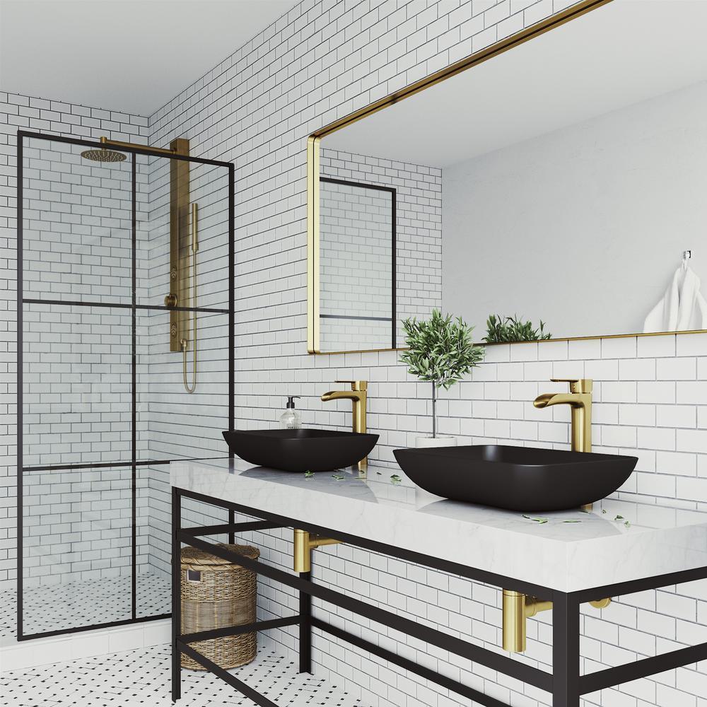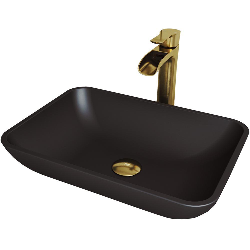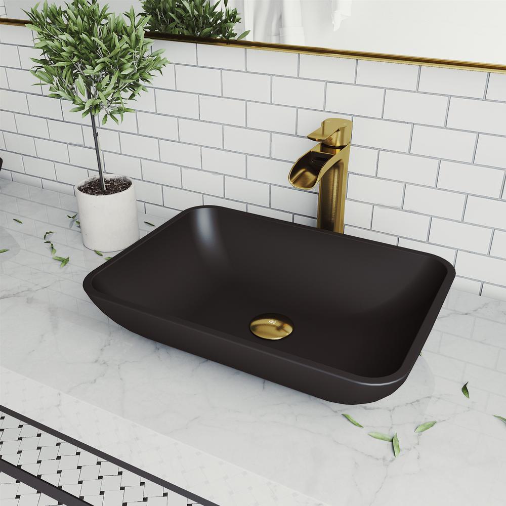 The VIGO Black Sottile Matte Shell Bathroom Vessel Sink with Seville Faucet Set shows quality construction and beautiful design in one impeccable pairing. Innovative and intense, Matte Shell sinks bring the same excellence of classic solid tempered glass sinks and take them to the next level. Its deep ebony shade is infused into the sink itself, eliminating any risk of a chipped finish. The sink has specialty fingerprint-free coating built into its construction for a mark-free appearance. Its partner, the VIGO Seville Vessel Bathroom Faucet, is a single-handle model outfitted in a fresh matte brushed gold finish. With exceptional hardware and a matching finish pop-up drain, this set is sure to impress all.