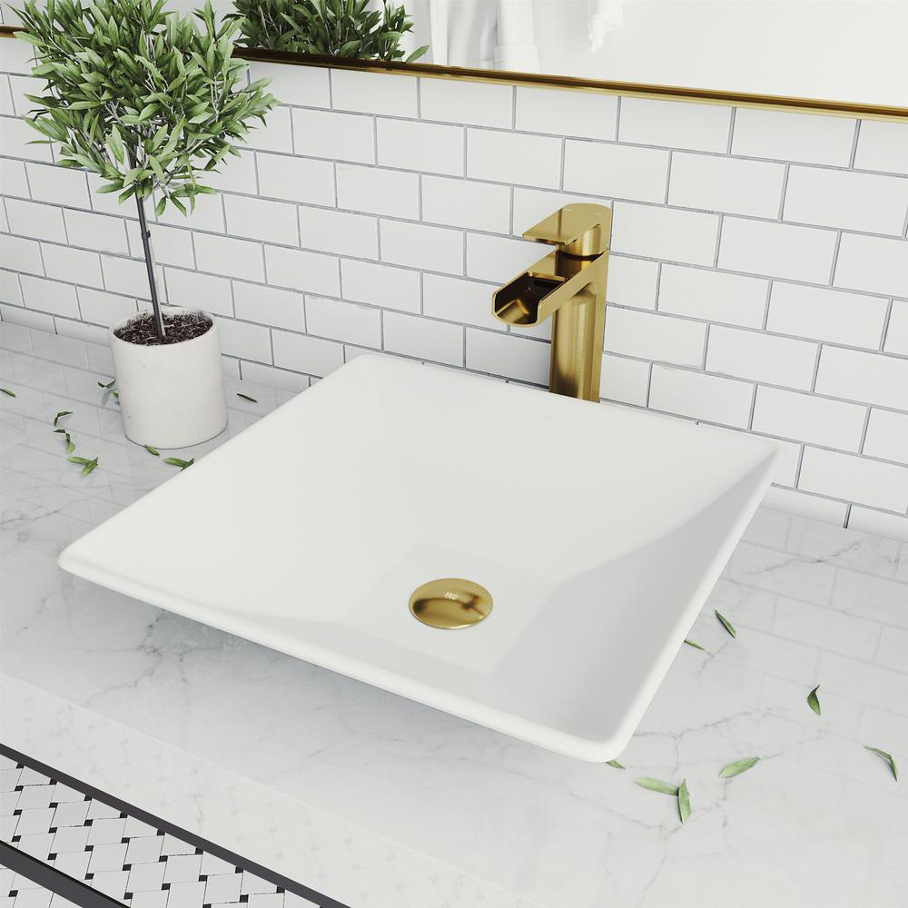 Durably built and designed for artistic excellence, the VIGO Hibiscus Matte Stone sink with the VIGO Amada Vessel Bathroom Faucet Set in matte brushed gold is modernity at its finest. The sink is made from VIGO's proprietary Matte Stone construction, a solid to the core, non-porous composite material that resists scratches, stains, and impact. Impressive in build and made to last for years of use, this sink is impeccable in both style and structure. making it just what you need to pair with a sleek faucet like the VIGO Amada Single-Handle Vessel Mount. This faucet has 100% solid brass construction, making it the epitome of strength and resilience. Its vessel mount installation frees up counterspace to offer a more spacious layout. The faucet's water volume and temperature operations are controlled by the use of just one, easy to use lever. With a 1.2 GPM flow rate, the VIGO Amada conserves water without compromising performance. Practical and stylish, this faucet does it all. The bathroom sink set comes complete with a matching matte brushed gold pop-up drain and mounting ring for your convenience.