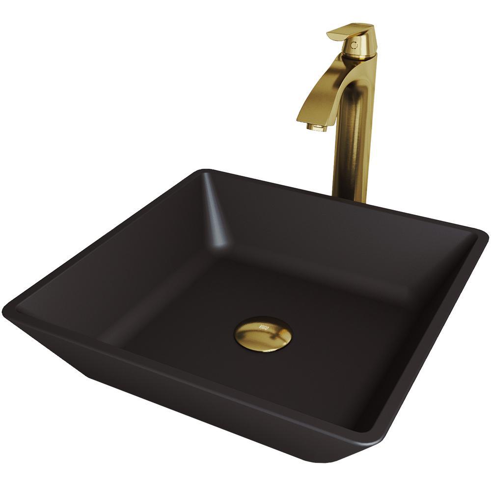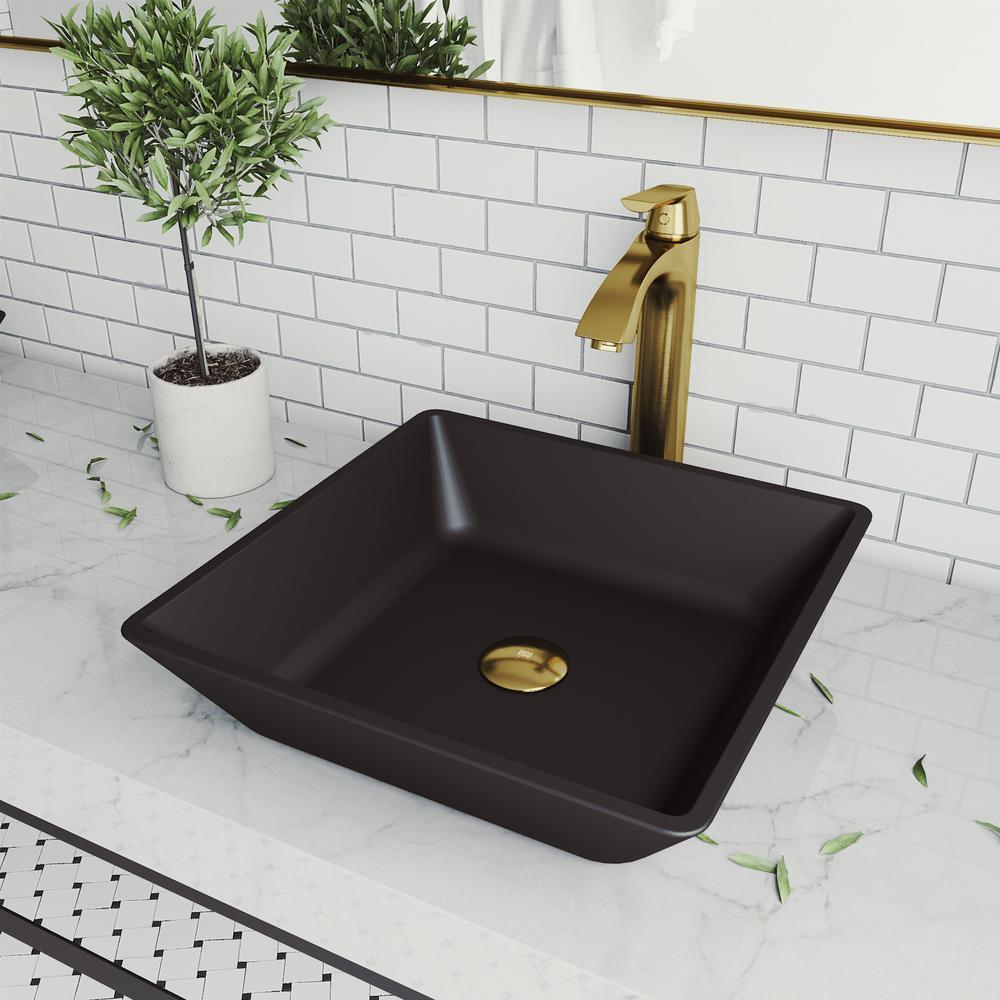From deliberate design and high-end construction comes the VIGO Black Serato Matte Shell Bathroom Sink Set. Innovative and intense, Matte Shell sinks bring the same excellence of classic solid tempered glass and take the construction to the next level. The Black Serato is deeply opaque and has an eggshell-like sheen that is rich yet subtle. Its deep ebony shade is infused into the sink itself, eliminating the risk of a chipped finish. It has a unique coating to prevent fingerprints and marks, leaving it pristine for years of use. This sink has a distinctive square, tapered shape that brings modernity into any bathroom. It is paired with the VIGO Linus, single-hole, vessel mount bathroom faucet. This easy-to-use faucet is tall without overpowering your space. It has exceptional hardware and is outfitted in a pristine matte brushed gold finish that resists rust, corrosion and tarnish. The set is made complete with a matching pop-up drain without overflow. Experience the synergy of character and style with this all-in-one bathroom set.