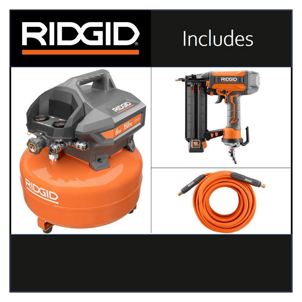 RIDGID introduces the 6 Gal. Compressor with 50 ft. Lay Flat Hose and 18-Gauge Brad Nailer. The compressor is perfect for trim and finish work with 150 PSI. Work with multiple people on the job site with dual universal quick connectors. It is equipped with a oil-free pump for maintenance-free performance. Backed by the RIDGID 3-Year Manufacturer's Warranty, this compressor includes an electric cord and an operator's manual. The Lay Flat Hose has a unique design that allows it to keep its shape, is kink resistant, and is non-tangling. The lightweight design and heavy duty 360° swivel fittings with bend restrictors are one of this hose's strengths. The Lay Flat Hose is able to flex in cold weather, which allows you to keep working in cold climates. It is 100% field repairable in case of an accidental tear. With 300 Max PSI capacity, the this hose can be used for heavy duty applications. The Lay Flat Hose is warranted against defective parts and labor. This 18-gauge brad nailer features CLEAN DRIVE Technology, which boasts 17X more consecutive perfect drives than the competition. CLEAN DRIVE Technology means you can spend less time fixing and more time working. With registration, this nailer is backed by the Industry's Only Lifetime Service Agreement. Included with the 18-Gauge 2-1/8 in. Brad Nailer are a tool bag, sample nails, and an operator operator's manual.