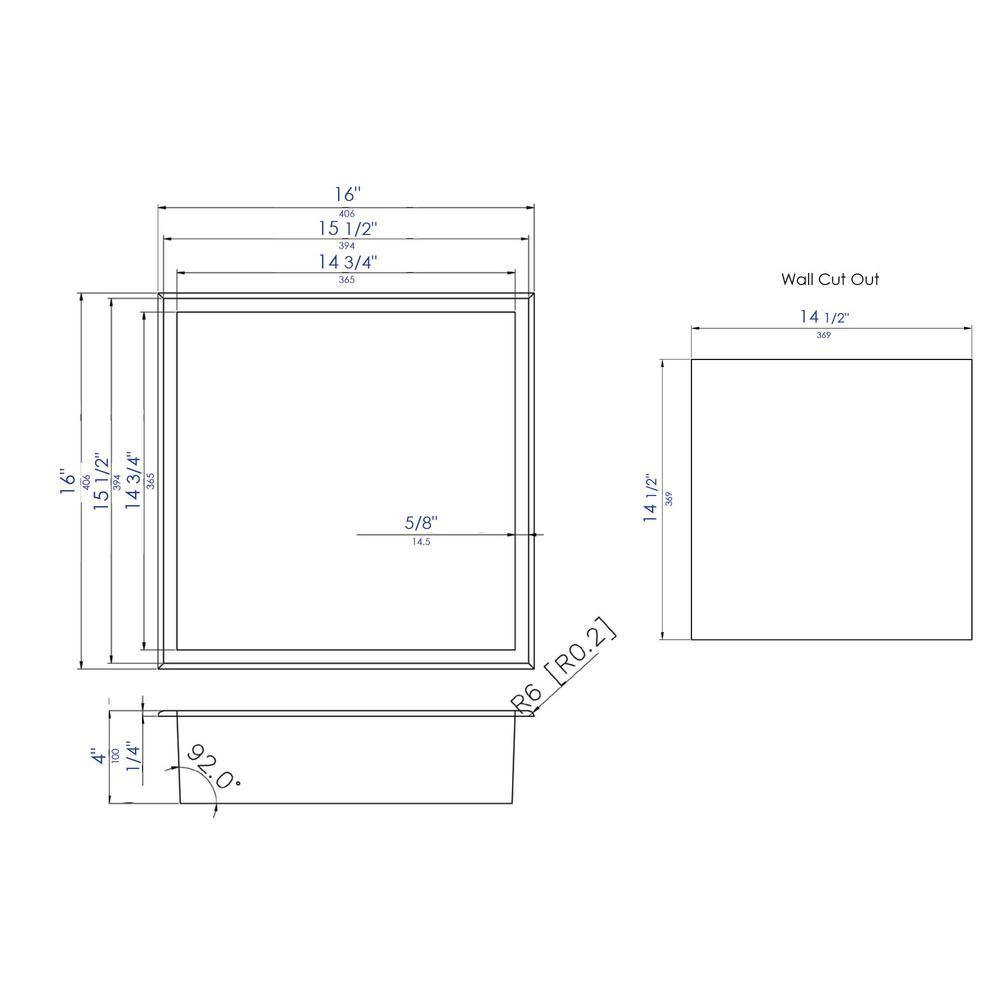 - Interior size: 14-3/4 in. x 14-3/4 in. x 3-7/8 in., the wall cut out dimensions are 14-1/2 in. x 14-1/2 in.