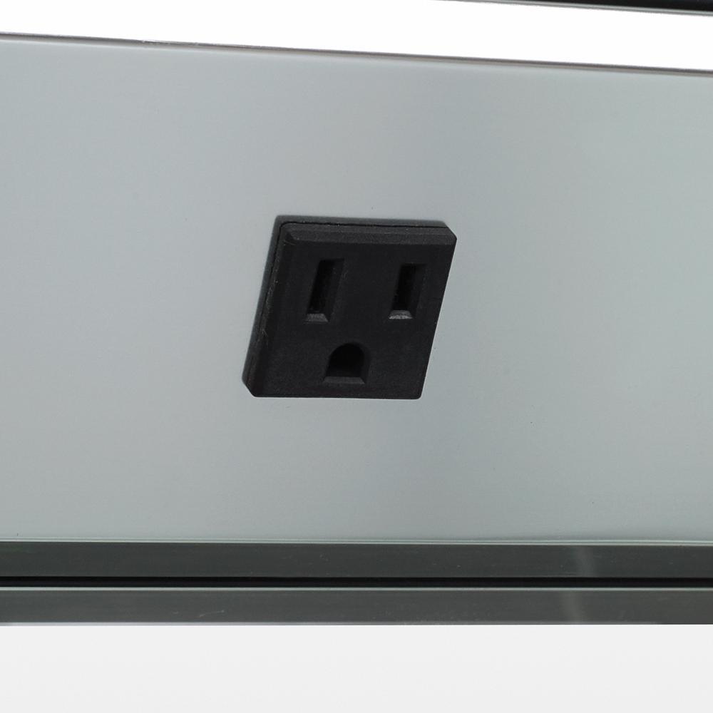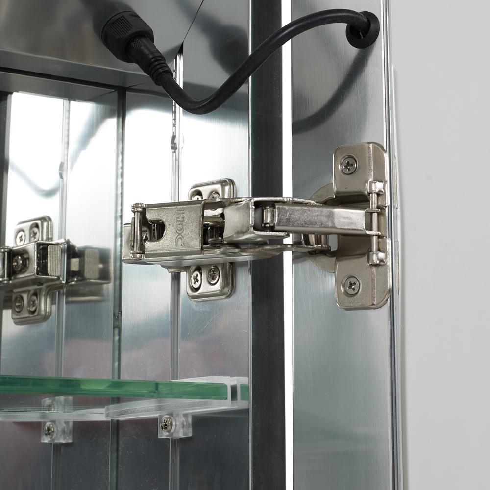 • Cabinet has mirrored side panels, an interior 3-prong outlet and premium hinges for its 2 doors
