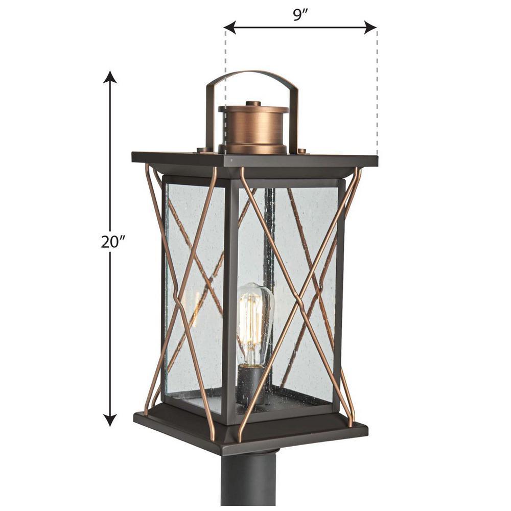 Transform your home into a warm and cozy dream with the friendly farmhouse-style of this post lantern. A rustic X-brace design decorates each side of the charming lantern silhouette. Clear seeded glass panes add an extra pop of rustic personality. An antique bronze finish complemented with antique copper accents adds warmth and character as the lantern infuses your home with gentle illumination.