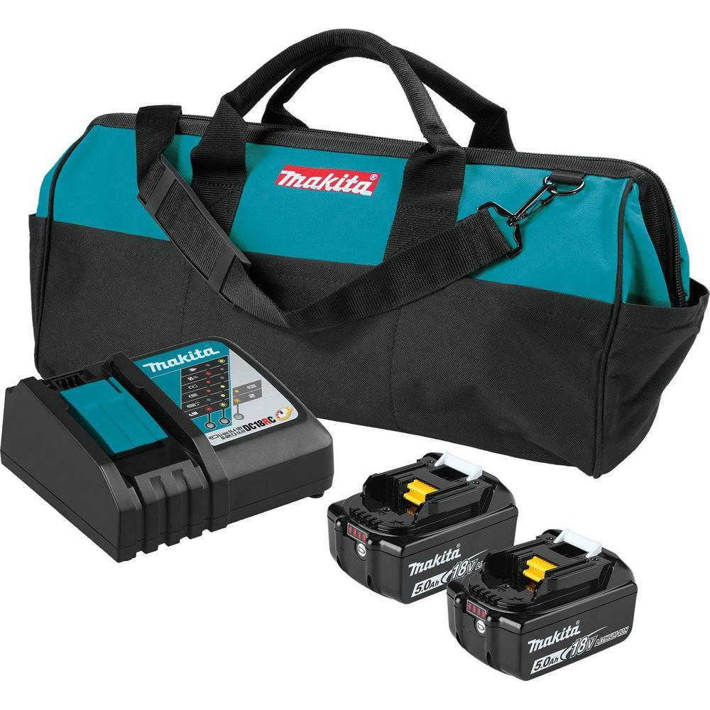 Build your own Makita Tool Kit with the 18V LXT Lithium-Ion Battery and Dual Port Charger Starter Pack (5.0Ah). Makita offers many cordless tools available as bare tools (tool only, no batteries or charger included). Pick up the Starter Pack, then purchase the 18V bare tools you need to get the job done including 18V X2 LXT Products powered by two 18V lithium-ion batteries. It's an ideal way to start building a Makita Cordless Tool System. Makita 18V Lithium-Ion Batteries resist self-discharge so they're ready for use even after long periods of storage. The Rapid Optimum Charger is a smart-charging system that communicates with the battery during charging to monitor current, voltage and temperature. This advanced charging technology helps optimize battery life and deliver a faster charge. The 18V Dual Port Rapid Optimum Charger (DC18RD) charges 2 batteries simultaneously, giving tool users unparalleled charging efficiency so their batteries spend more time working and less time sitting on the charger. For improved tool performance and extended battery life, Makita created Star Protection Computer Controls. Star Protection is communication technology that allows the tool and battery to exchange data in real time and monitor conditions during use to protect against overloading, over-discharging and overheating. Makita, the innovation leader in cordless tool technology, has the worlds largest cordless tool system powered by 18V lithium-ion slide-style batteries.