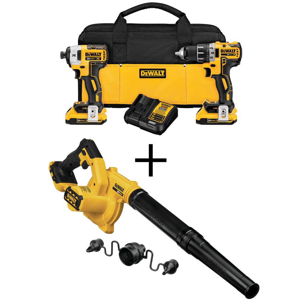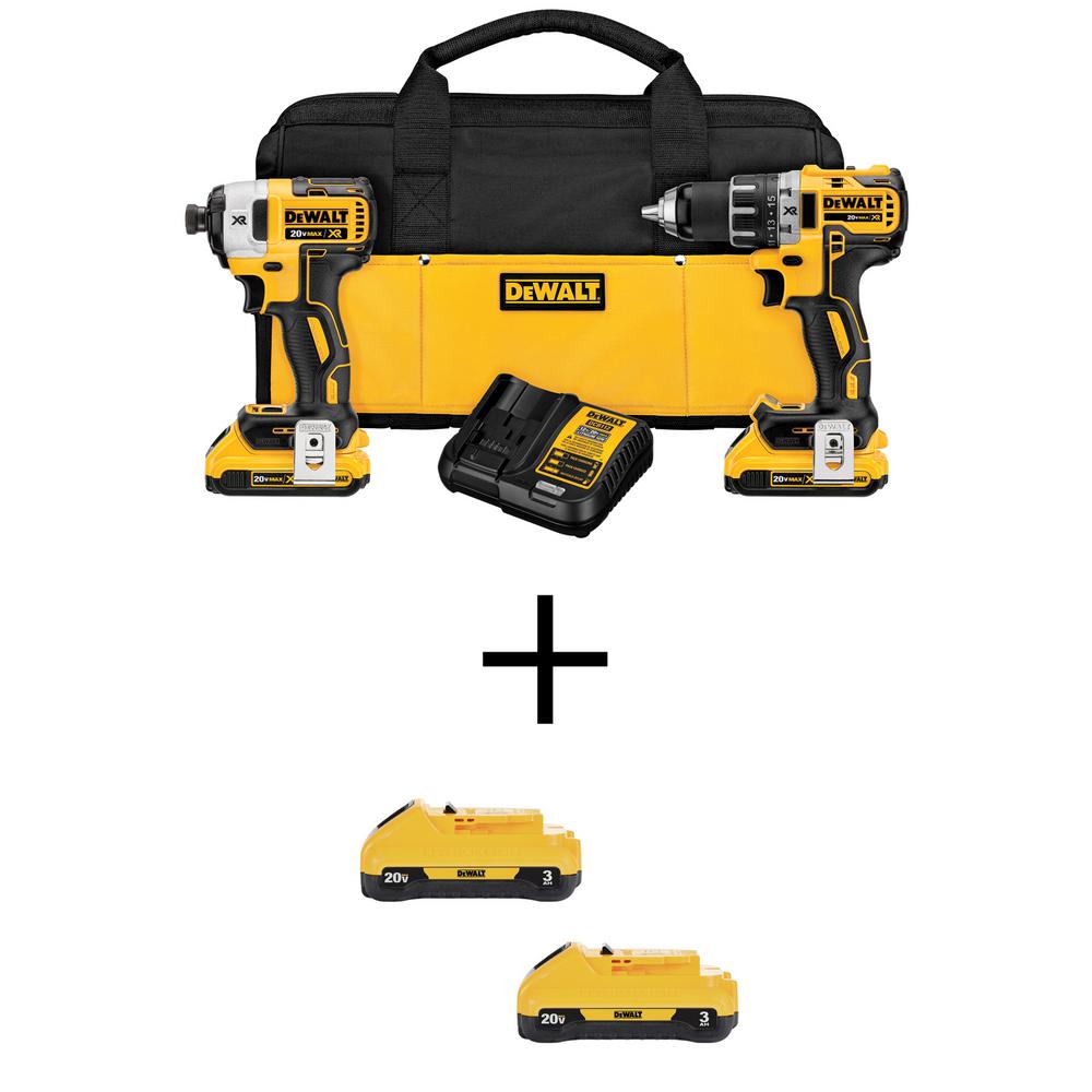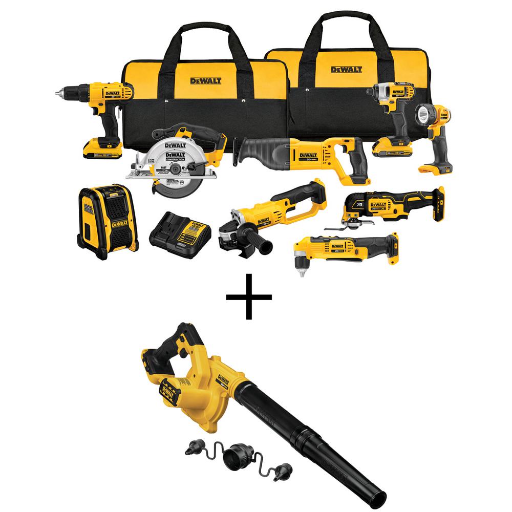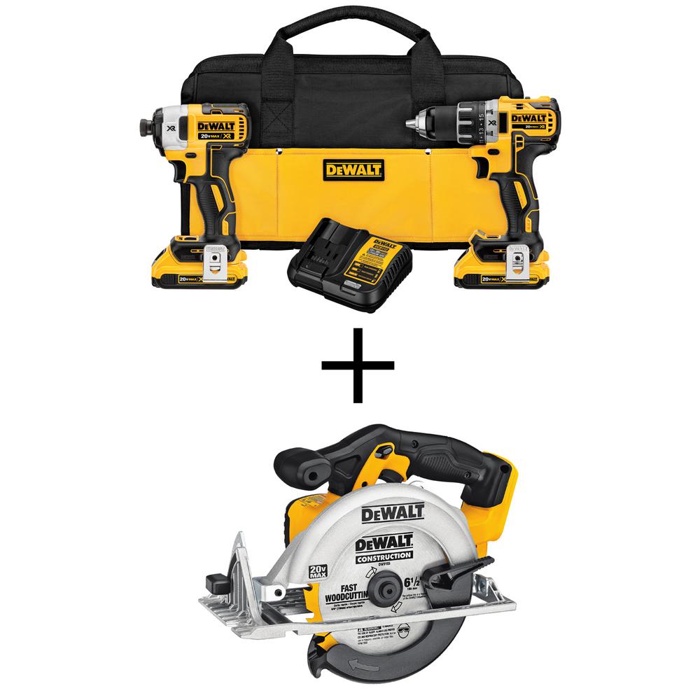 This 20V MAX* Cordless Compact 7-Tool Combo Kit includes one 4 Ah battery and two compact 2 Ah batteries. It's a versatile kit, featuring our a brushless hammer drill which is lightweight and compact for big jobs in tight spaces. The impact driver has a 2-speed transmission with up to 1500 RPMs for a range of fastening and drilling applications. Cut 2x4 lumber at a 45-degree angle in a single pass using the Circular Saw with included 6-1/2 in. Carbide Blade. The brushless random orbital sander has a variable speed dial for control from 8,000 – 12,000 OPM to match the speed to the application. The Grinder features Quick-Change™ wheel release for fast and easy wheel changes. . The bright LED Flashlight illuminates your work area with 110 lumens. The Oscillating Multi-Tool features a 3-speed selector allowing users to choose their speed setting based on application.