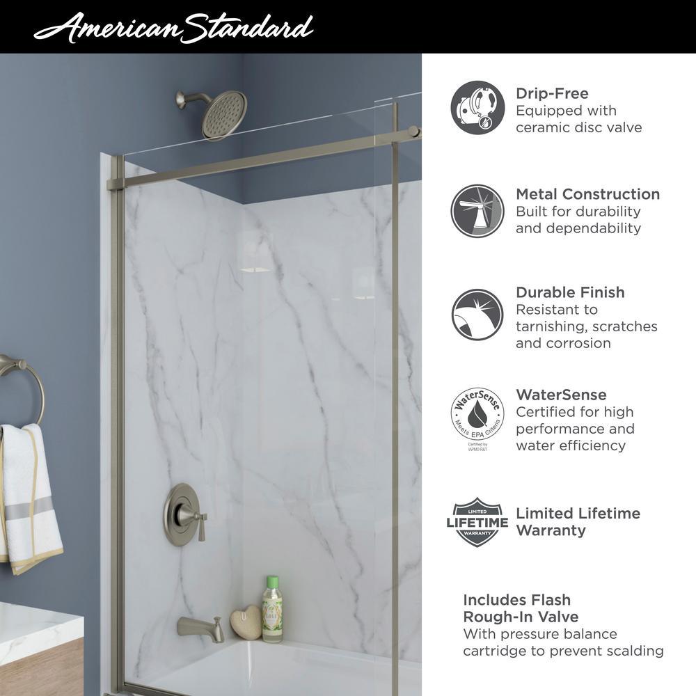 The Rumson Tub and Shower Trim Kit from American Standard is a traditional look designed to complement the Rumson faucet collection. This classic style, with sturdy lever handle, is engineered for lasting durability and a lifetime of drip-free performance, a hallmark of every American Standard faucet. Trim kit includes wide, single-spray shower head, pressure balance valve, lever handle, escutcheon plate and diverter tub spout, combining everyday practicality and enduring beauty for the perfect bathroom update.