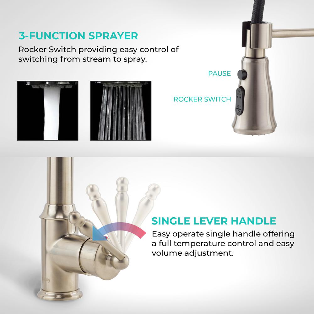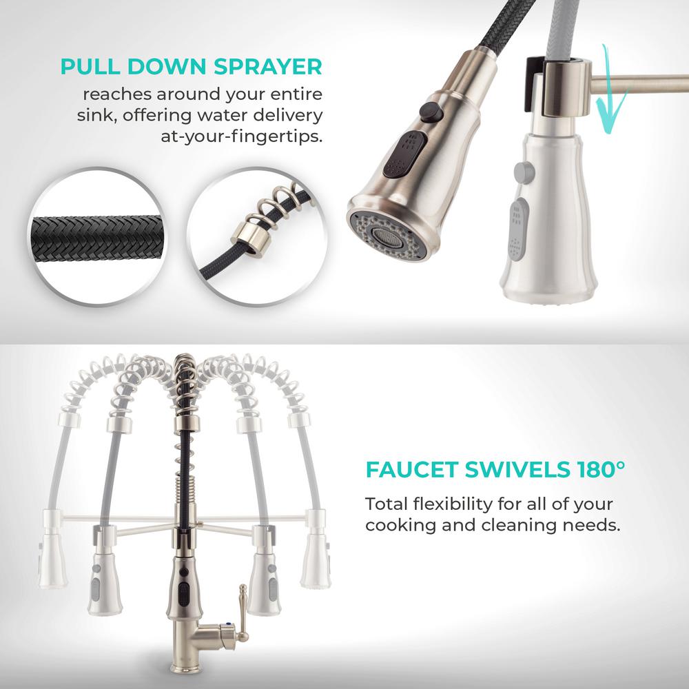 • Includes: spring neck kitchen faucet, colander, drying rack, drain strainer, cutting board, and mounting hardware