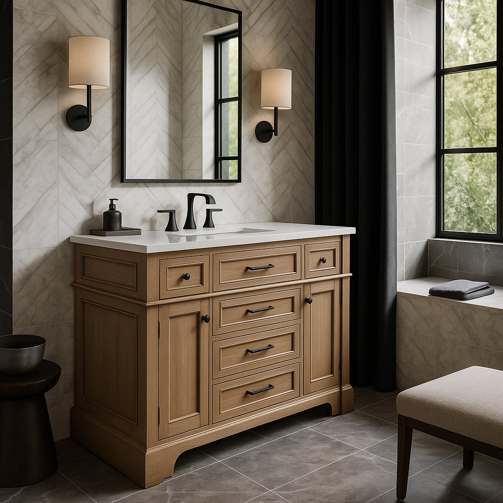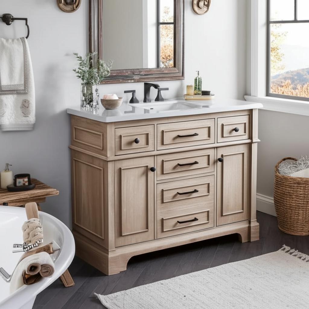 Transform your bathroom into a sanctuary of sophistication with the Melpark 48-inch vanity. Its antique oak finish and engineered marble top exude timeless elegance, while the thoughtful storage solutions keep your space organized and clutter-free. Pair it with brushed nickel or black hardware to complement your decor style. This vanity is not just a functional piece but a statement of luxurious living.