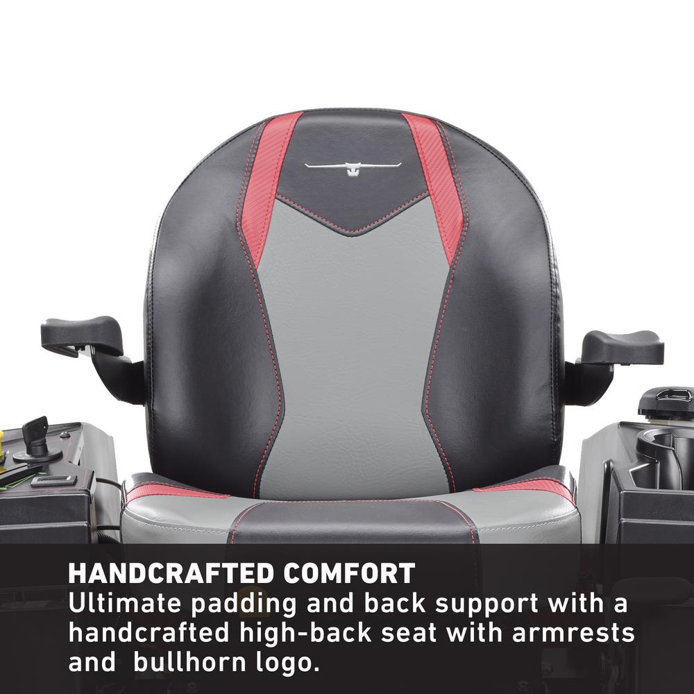 - Handcrafted comfort, ride your mower in style with a handcrafted high-back seat with arm rests and Toro's iconic bullhorn logo, you can trust you seat provides the ultimate in padding and back support