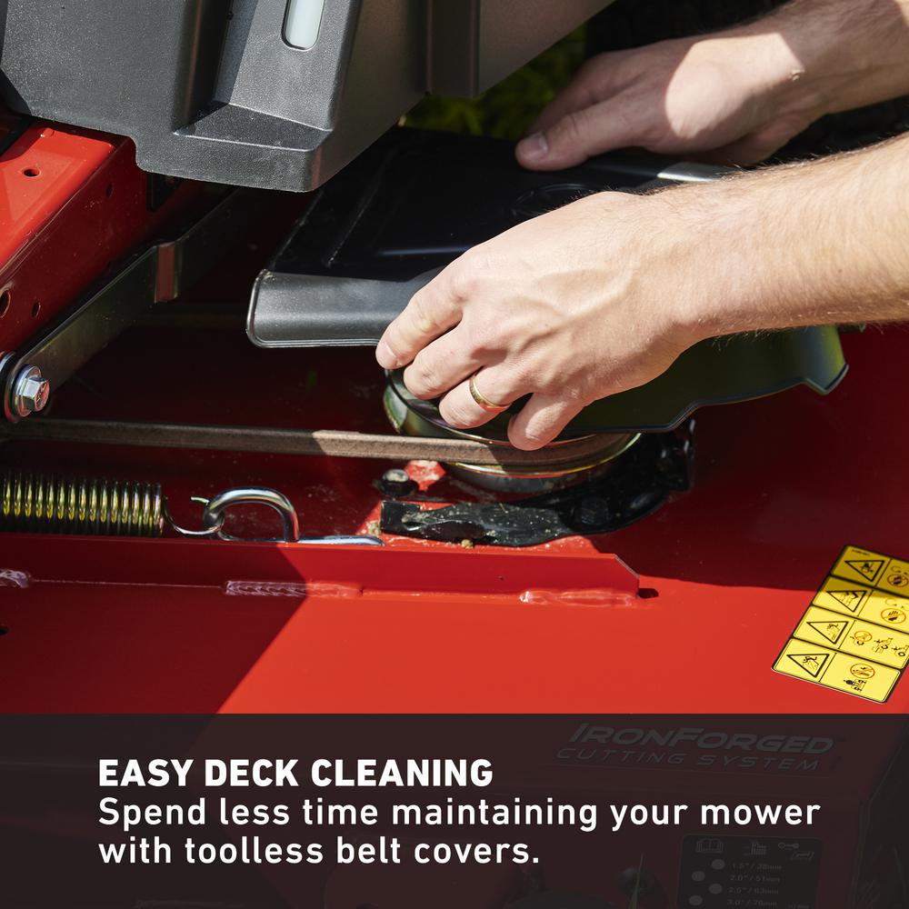- Hassle-free maintenance, spend less time maintaining your mower with toolless oil change and filter and belt cover, simply unlatch the belt cover and easily sweep away debris to prevent deck corrosion and belt wear
