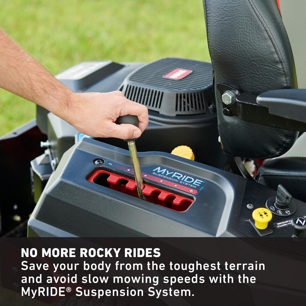 - No more rocky rides, you shouldn't feel like you went 12 rounds with your lawn after you've mowed it, save your body from the toughest terrain and avoid slow mowing speeds with the MyRIDE suspension system, MyRIDE keeps you perched above the action and any body blows from your lawn are absorbed by the mower, not you