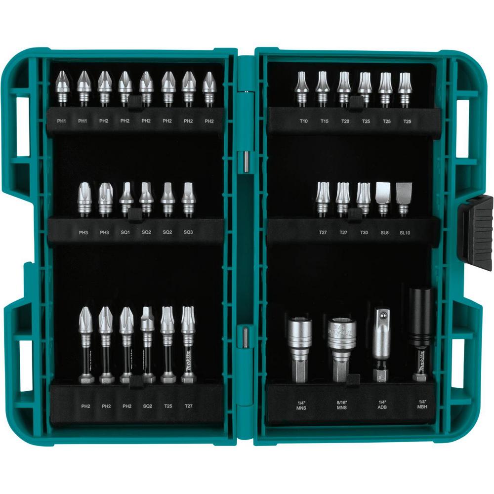 The Makita 18-Volt LXT Lithium-Ion Brushless Cordless Quick-Shift Mode 3-Speed Impact Driver (model XDT14Z, tool only) is a best-in-class fastening solution for users who want more torque, longer run-time and precision fastening features. The XDT14Z delivers all of the above in a compact size with a superior power-to-weight ratio. The XDT14Z combines a full 1,550 in. lbs. of fastening torque with category-leading precision features. Quick-Shift Mode is an automatic electronic controller that downshifts and reduces rotation and impact speed prior to driving the screw into place. It is engineered to minimize screw thread stripping, screw breakage and damage to work. For faster tightening of self-drilling screws, use the Tightening Mode (T-mode) and avoid damage to the screw or work piece. These precision settings, combined with 3-speed power settings, give users more control for a wide range of fastening tasks from cabinet screws and deck screws to lag bolts and much more. It is only 4-5/8 in. long and ideal for work in tight spaces. For increased versatility, the tool can also be powered by Makita 18-Volt LXT and Compact Lithium-Ion batteries with the star symbol on the battery indicating Star Protection inside. This bundle also comes with E-01672 Impact XPS 10 Piece 3/8 in. Drive 6-Point SAE Impact Socket Set w/Standard Socket Adapter and E-01666 Impact XPS 35 Piece Impact Bit Set.