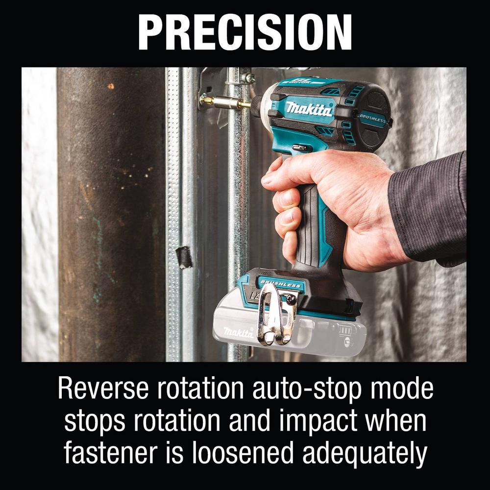 Makita has a legacy of innovation in the cordless impact driver category and the 18-Volt LXT Brushless 4-Speed Impact Driver (XDT16Z) sets new standards. The XDT16Z offers users 4 speeds, as well as Makita's exclusive Quick-Shift Mode for increased fastening control. Quick-Shift Mode uses the brushless motors electronic controls to find the best balance of speed and torque for each application for more efficient fastening. Another precision setting is Tightening Mode (T-mode), which downshifts and reduces rotation and impact speed prior to driving the screw into place and is engineered to minimize screw thread stripping, screw breakage and damage to work. The XDT16Z delivers industry-leading performance in a compact and ergonomic design. Added features include the 1 touch 4-speed power selector button under the chuck, which enables 1-handed speed changes and reverse rotation auto-stop mode which stops rotation and impact when the fastener is loosened adequately to help prevent over-loosening and dropped fasteners. Its part of Makita's expanding 18-Volt LXT system, the worlds largest cordless tool system powered by 18-Volt Lithium-Ion batteries. Makita 18-Volt LXT batteries have the fastest charge times in their categories, so they spend more time working and less time sitting on the charger. This bundle also comes with E-01672 Impact XPS 10 Piece 3/8 in. Drive 6-Point SAE Impact Socket Set w/Standard Socket Adapter and E-01650 Impact XPS 45 Piece Impact Bit Set.