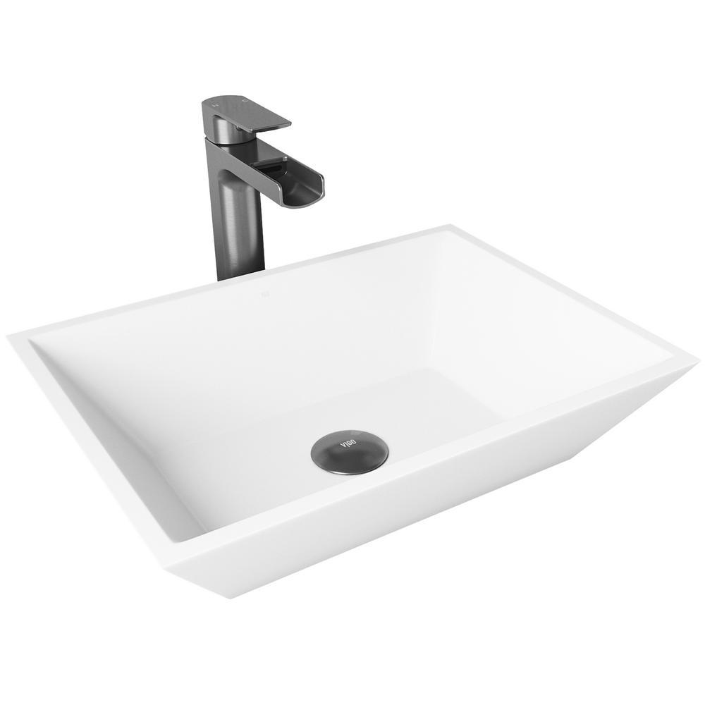 Durability drives the force behind the VIGO Vinca Matte Stone sink with the VIGO Amada Vessel Bathroom Faucet Set in graphite black. This bathroom vessel set offers modernity at its finest. The sink is made from VIGO's proprietary Matte Stone construction, a solid to the core, non-porous composite material that resists scratches, stains and impact. Impressive in build and made to last for years of use, this sink is impeccable in both style and structure. It is durable and stylish, making it just what you need to pair with a sleek faucet like the VIGO Amada Single-Handle Vessel Mount. This faucet has 100% solid brass construction, making it the epitome of strength and resilience. Its vessel mount installation frees up counterspace to offer a more spacious layout. The faucet's water volume and temperature operations are controlled by the use of just 1, easy to use lever. With a 1.2 GPM flow rate, the VIGO Amada conserves water without compromising performance. Practical and stylish, this faucet does it all. The bathroom sink set comes complete with a matching graphite black pop-up drain and mounting ring for your convenience.