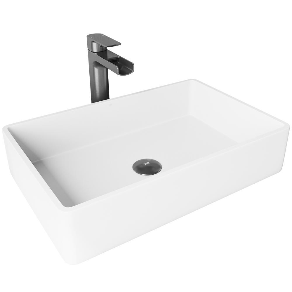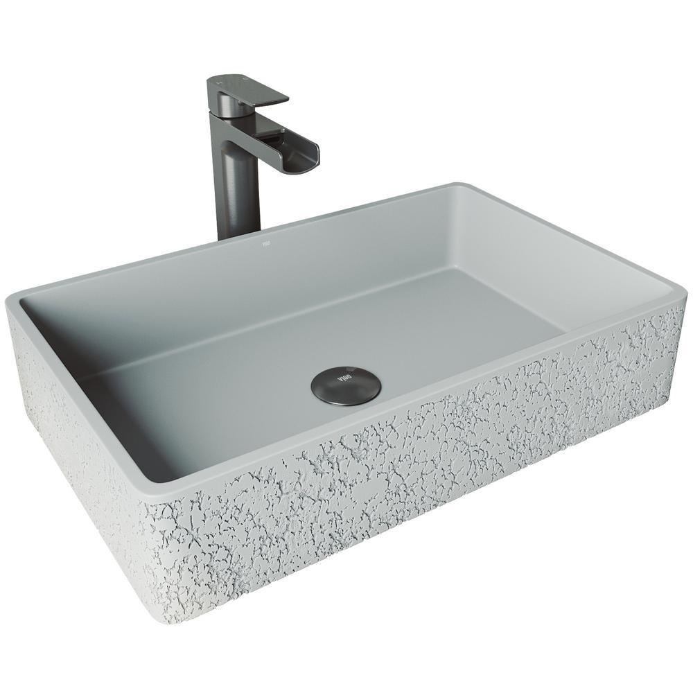 Durably built from all-natural composite, VIGO Cast Stone Vessel Bowl Bathroom Sinks offer modernity at its finest. This model is the Dahlia, a distinctive rectangular design featuring a high-end concrete composite. Solid to the core and non-porous, this material that resists scratches, stains and impact. Impressive in build and made to last for years of use, this sink is impeccable in both style and structure making it just what you need to pair with a sleek faucet like the VIGO Amada Single-Handle Vessel Mount. This faucet has 100% solid brass construction to bring you the epitome of strength and resilience. Its vessel mount installation frees up counterspace to offer a more spacious layout. The faucet's water volume and temperature operations are controlled by the use of just 1, easy to use lever. With a 1.2 GPM flow rate, the VIGO Amada conserves water without compromising performance. Practical and stylish, this faucet does it all. The bathroom sink set comes complete with a matching graphite black pop-up drain and mounting ring for your convenience.
