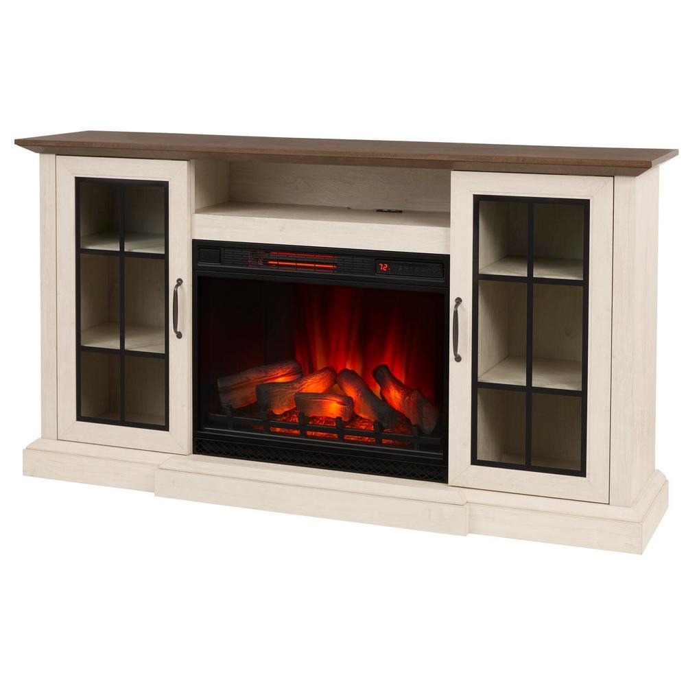 Rustic, weathered chic with striking black mullions make the Vinegate the piece you've been searching for. Accommodating most flat screen TVs up to 80 in. and 90 lbs., this TV stand with electric fireplace offers a concealed charging station built into the media bay helps you keep devices charged with 2 USB ports. The supplemental zone heating efficiently heats up to 1,000 sq. ft. of your home so that you can lower electric bills and save money. The infrared quartz technology works to maintain natural humidity for a superior warmth that won't dry out the air. Patent pending 3D Flame Effect technology offers a layered flame effect with 5 adjustable brightness settings on a realistic log set and ember bed, so you can create your ideal fire that is both cozy and beautiful. and you can enjoy those beautiful flame effects all year-long because they can be operated with or without the heat. Patented Safer Plug fire prevention technology gives you peace of mind by monitoring the temperature of the plug and shutting off automatically if unsafe conditions arise.
