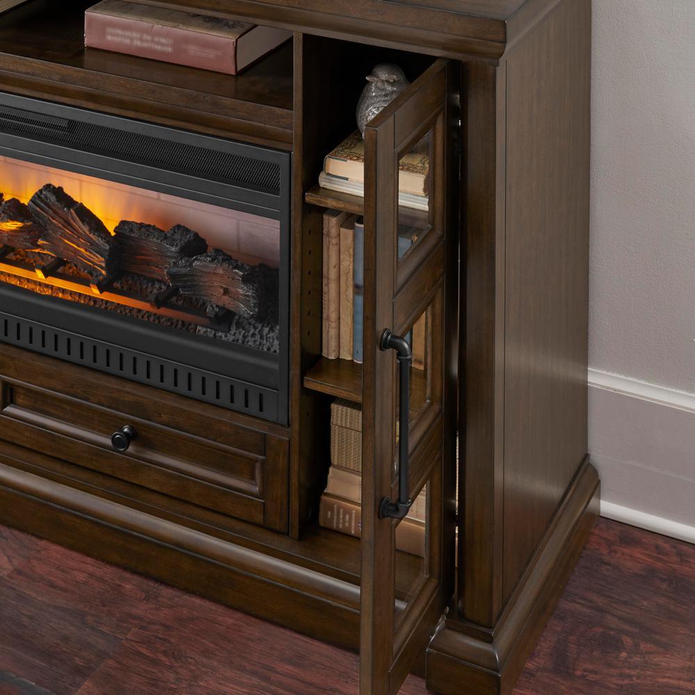 The 72 in. Electric Fireplace will transform your living room or family room into a warm, comfortable and stately showplace. The quality construction of hardwoods and laminates are made even more impressive by the craftsmanship of the Rich Brown Cherry finish. Enjoy family gatherings, game day parties and date nights in front of a cozy fire. The Console offers realistic log and flames with energy efficient LED technology and 4 flame heights. Enjoy cozy fires year round with or without heat. With its 5,200 BTU infrared heater, the electric fireplace can warm even the largest rooms. Control the temperature range, 62°F to 82°F and flame display with the handy remote control. The fireplace console can accommodate flat panel TVs and includes cabinets for storing media and gaming accessories. Now any room can be a cozy haven with the Fireplace Console. For flat panel TVs (not for use with CRT TVs) Sturdy hardwood construction Durable Rich Brown Cherry finish Cabinets store your media and gaming accessories Console requires assembly 42 in. Infrared electric fireplace insert 1,500-Watt/5,200 BTUs of infrared heat Realistic logs and embers Temperature range control: 62°F to 82°F Easy set up plugs into standard 120-Volt/60 Hz electrical outlet.