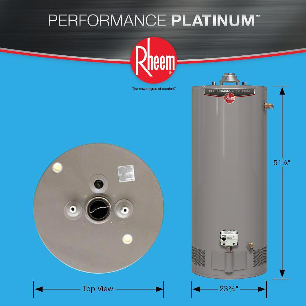 The Rheem Performance Platinum 50 Gal. Natural Gas Short Water Heater comes with a 40,000 BTU/hour environmentally friendly Low-NOx burner that provides ample hot water for households with 3 to 5 people. The electronic ignition system eliminates the standing pilot light, saves energy and monitors system performance. Its maintenance free combustion air intake system means there are no filters to clean and replace. A patented magnesium anode rod design incorporates a special resistor that protects the tanks from rust, providing longer tank life. Factory installed temperature and pressure relief valve and 3/4 in. water connections are included with the water heater for easy installation. The water heater is ENERGY STAR qualified. This Rheem Performance Platinum model is Wi-Fi compatible allowing for remote monitoring of the water heater's operation (Wi-Fi Module REWRA631GWH sold separately).