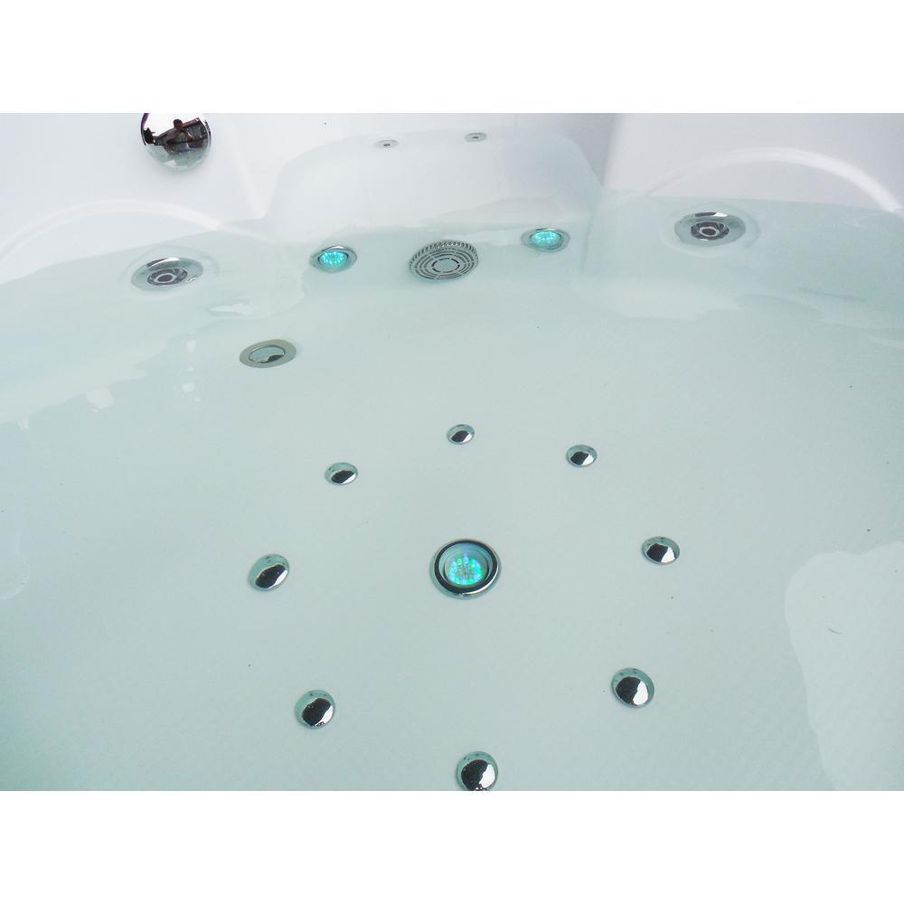 Whirlpool bathtub 59.05 in. x 59.05 in. hot tub double pump with heater and Bluetooth - Sant’Angels. 2 person Whirlpool bathtub with heater and Bluetooth: Size 59.05 in. L x 59.05 in. W x 22 in. High. Technical specifications: Bath tub size: base 59.05 in. L x 59.05 in. W x 22 in. High Water Jet Pump (1HP, 750-Watt) Drain placement: reversible (all installations are possible) Integrated heater to keep the water temperature constant Bluetooth connection system to listen all music directly in the tub 4 adjustable massage 12 Whirlpool jets 250-Watt Air pump with 8 air nozzles 8-pieces front apron lights (changing colors) Air jet control system 3 Big LEDs underwater light 2 Padded headrests Control panel(computer) Radio FM 2 Loudspeakers Shower Wand Waterfall Faucet Cold and hot water faucet included One Switch Towel rack piece back-water valve Power 110-Volt - 25 Amp Electric leakage protection system (automatic circuit breaker) Weight: 220 lbs. Color Bathtub: White high quality sanitary acrylic bath tub Steel frame Front glass.