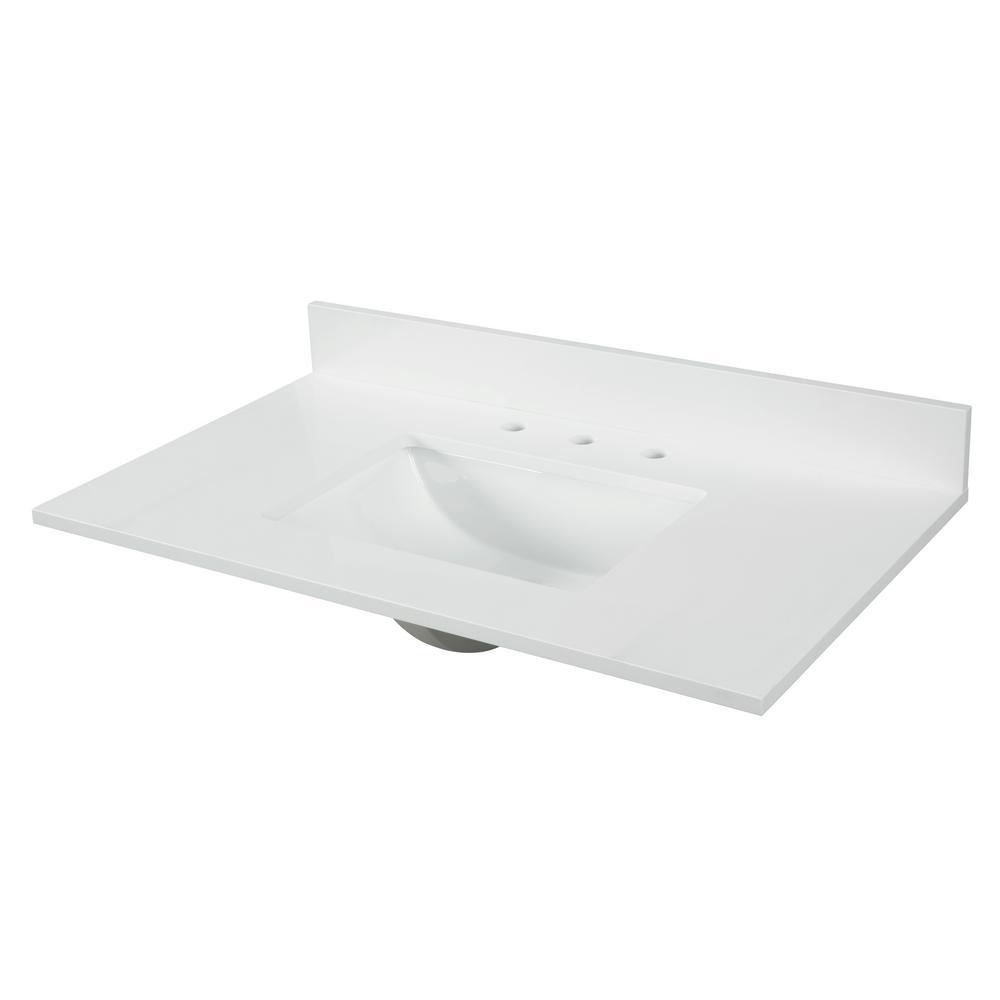 37 in. Snow White Quartz Top. Attached stylish rectangular white vitreous china undermount bowl with safety overflow hole. 4 in. high backsplash included to help protect walls from water damage.