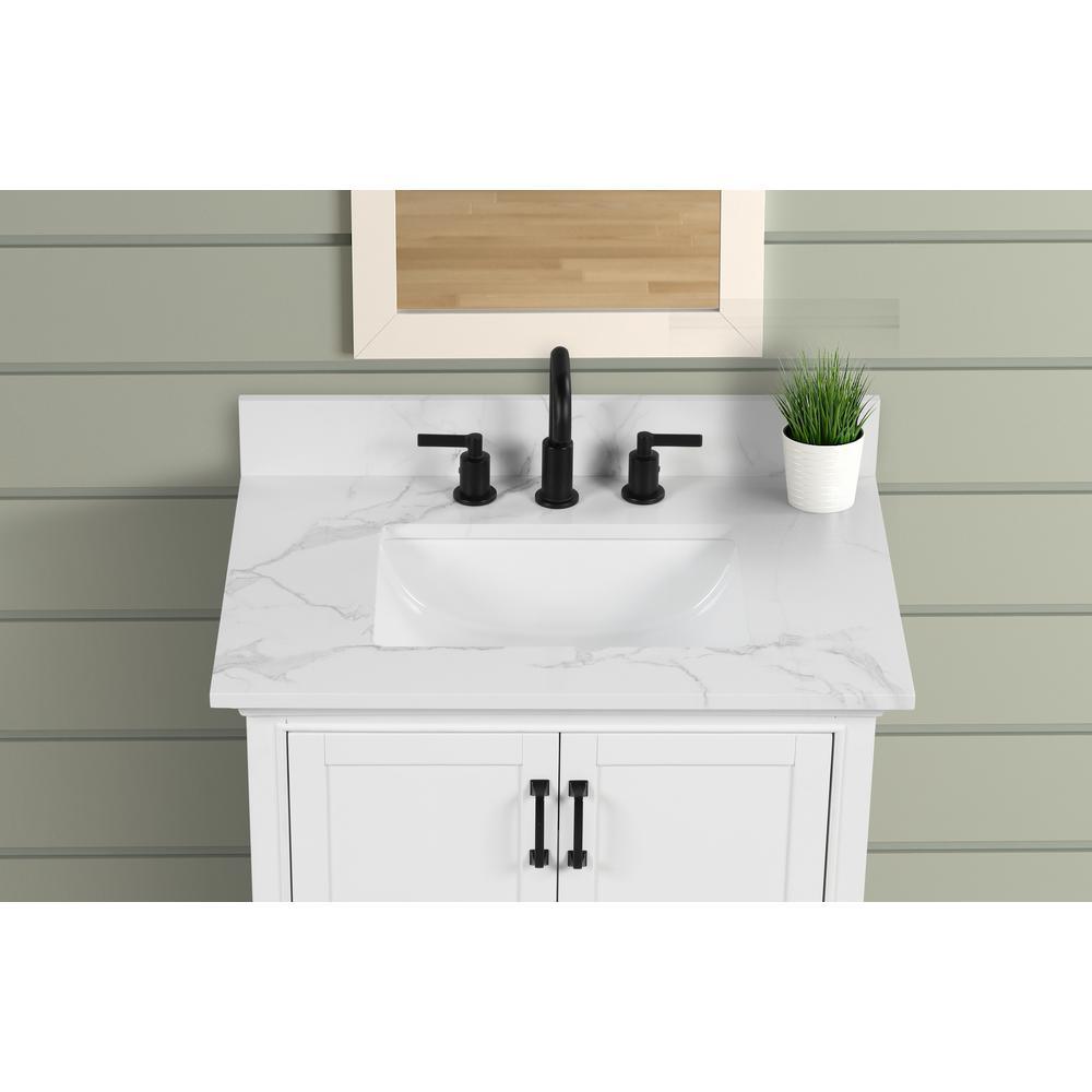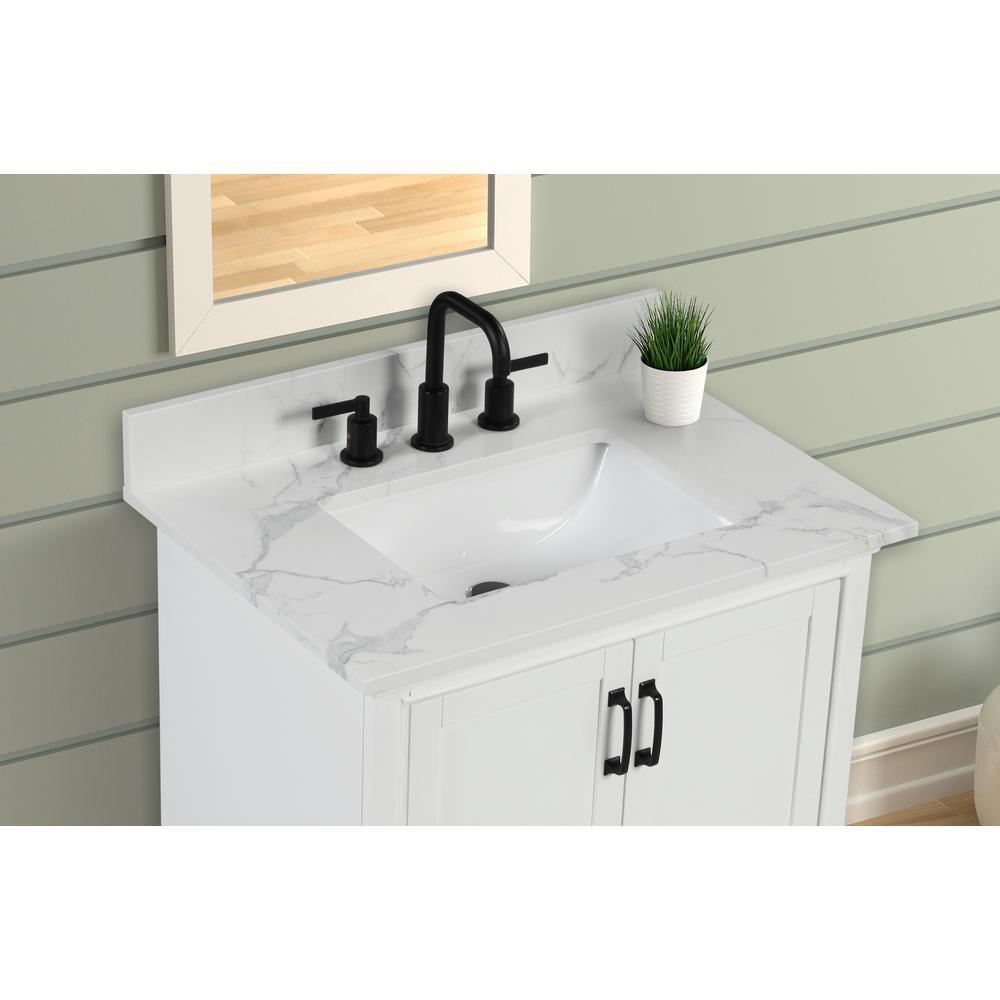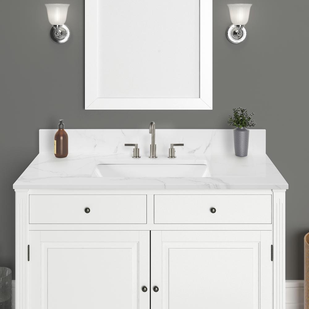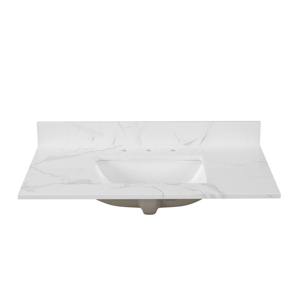 37 in. Calacatta White Engineered Marble Top. Attached stylish rectangular white vitreous china undermount bowl with safety overflow hole. 4 in. high backsplash included to help protect walls from water damage.