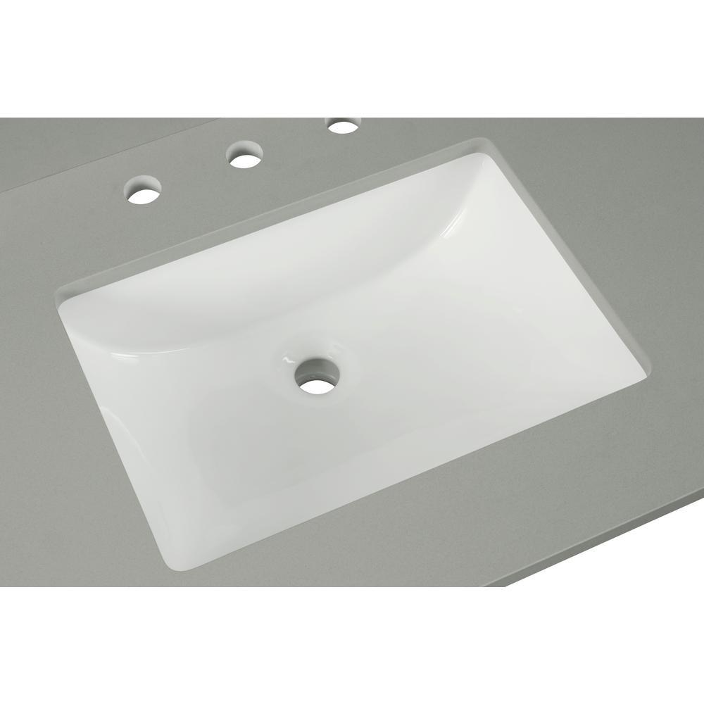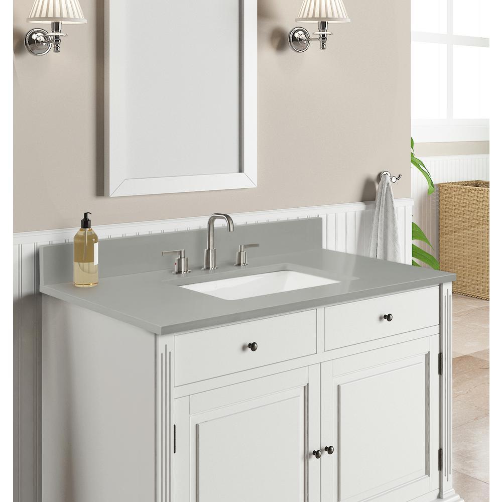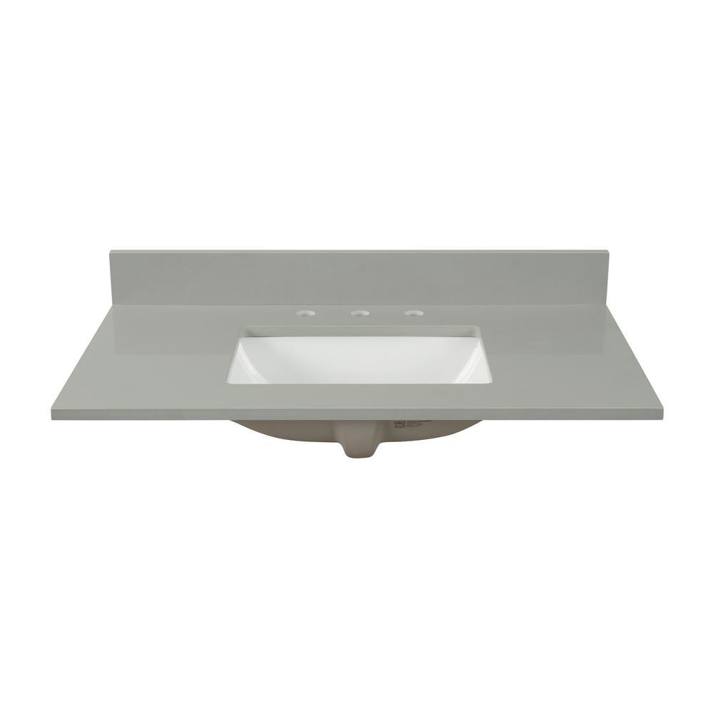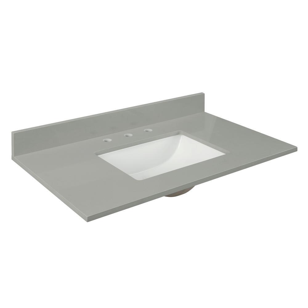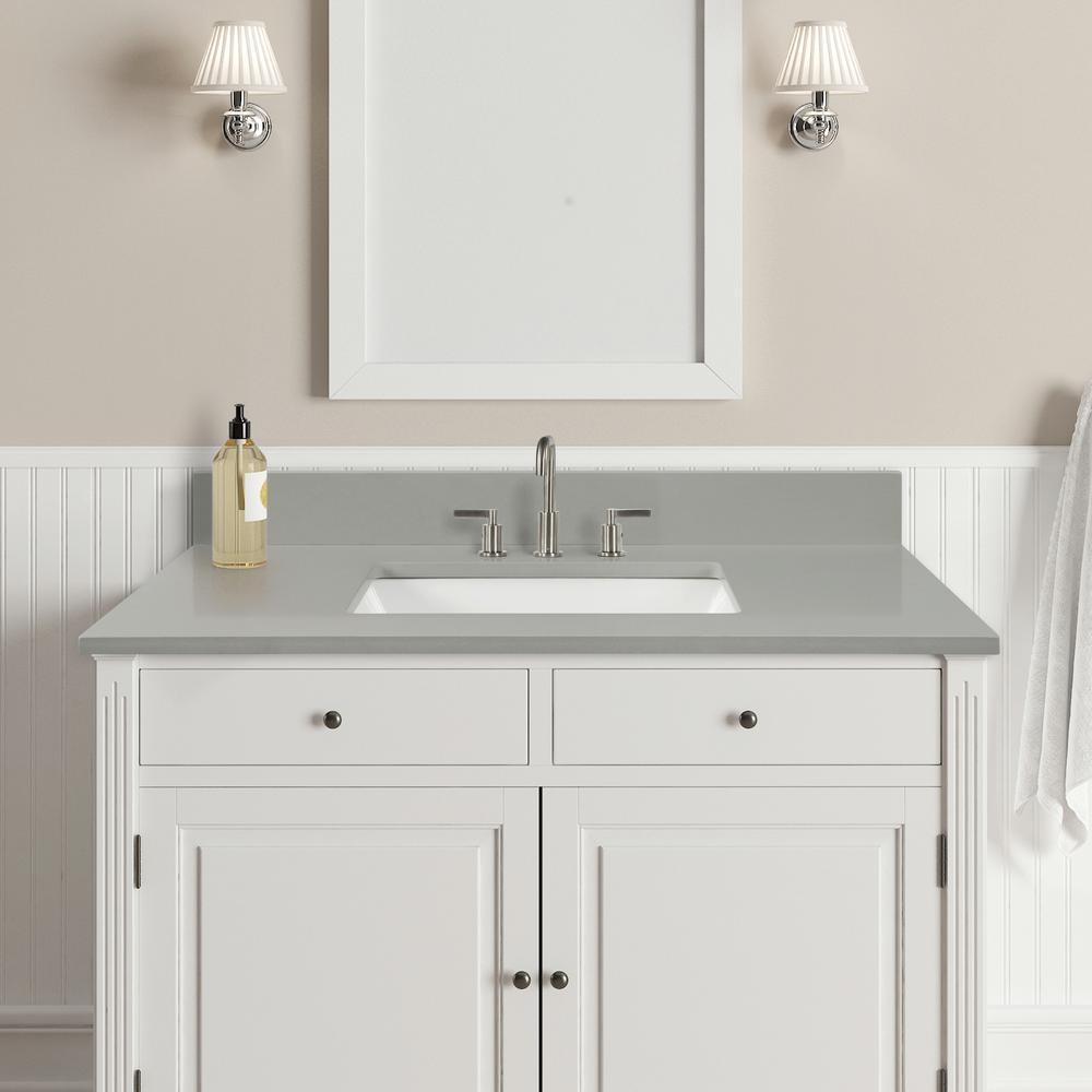 31 in. Earth Gray Quartz Top. Attached stylish rectangular white vitreous china undermount bowl with safety overflow hole. 4-in high backsplash included to help protect walls from water damage.