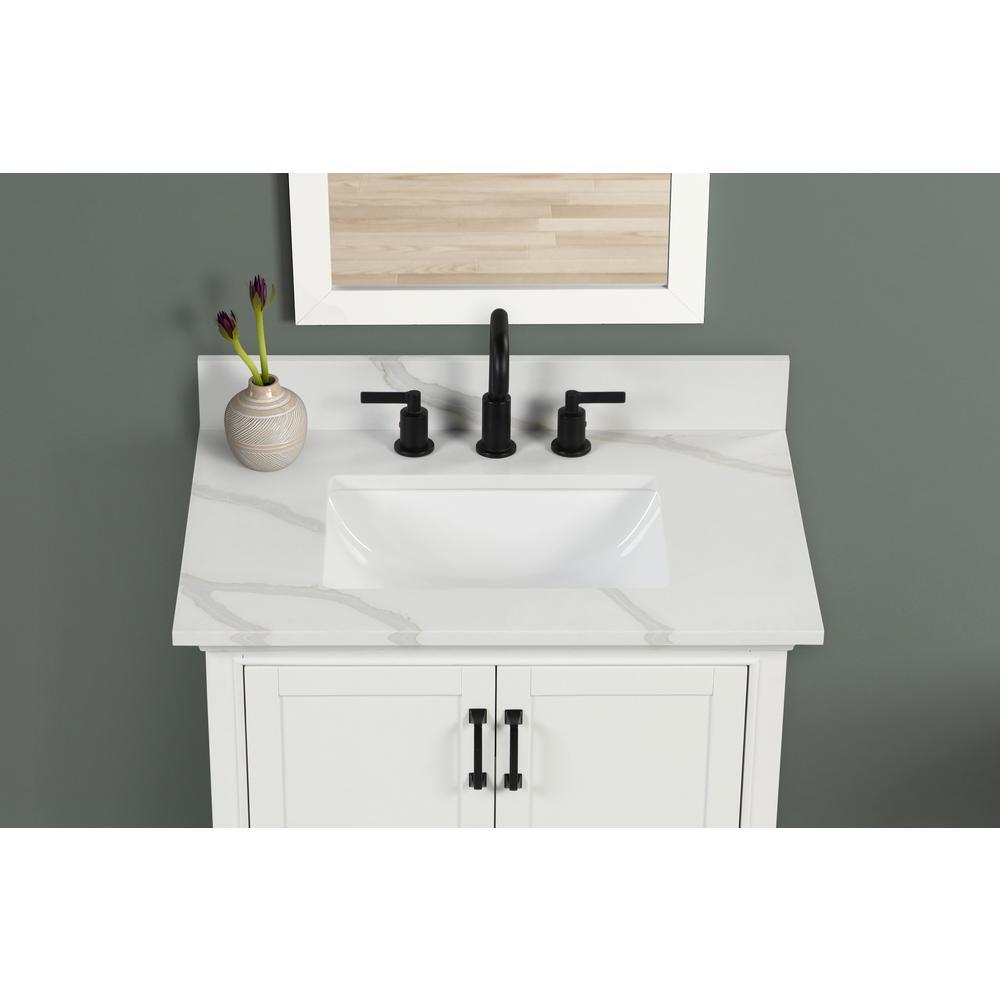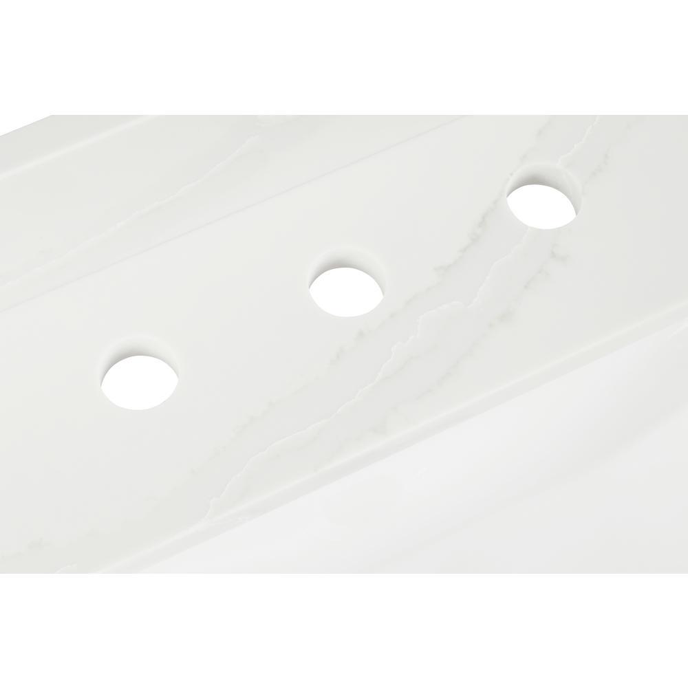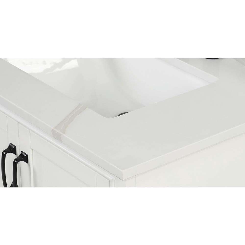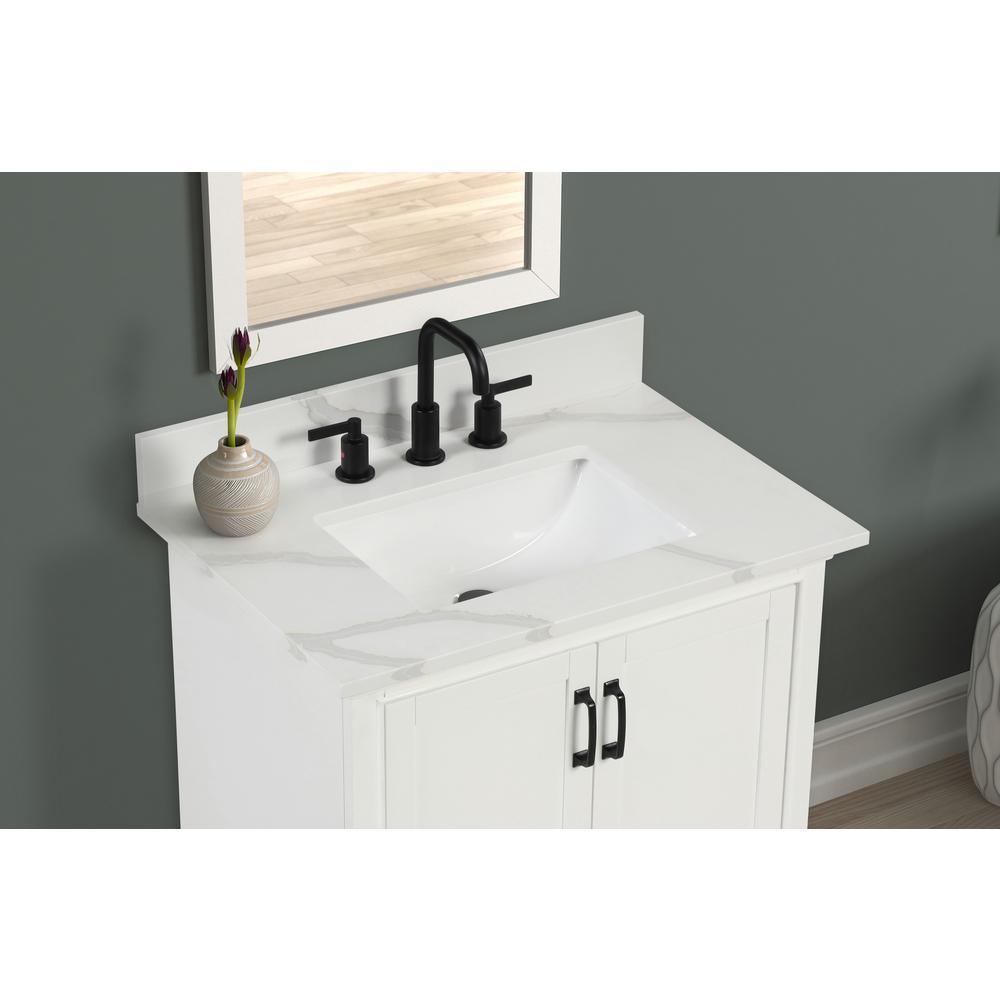 31 in. Statuario White Quartz Top. Attached stylish rectangular white vitreous china undermount bowl with safety overflow hole. 4 in. high backsplash included to help protect walls from water damage.